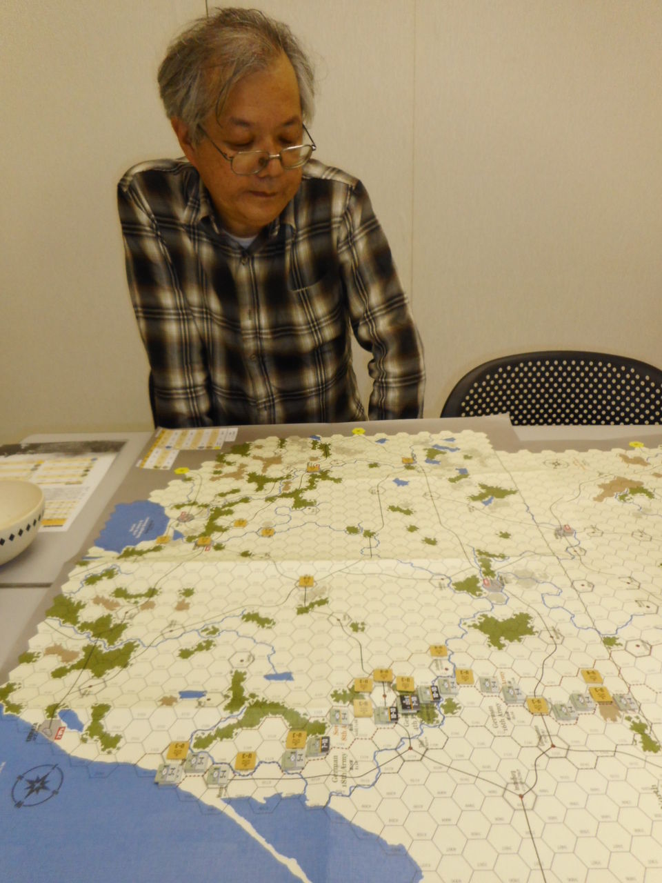 お昼過ぎに来場したはねはねさんを誘って、3時代を駆け抜けた一番ホットな作戦級アイテム「独ソ電撃戦」(CMJ)のリガ'41を対戦することに。あえて不利なソ連軍でいいですよと、はねはねさんが労農赤軍を、mitsuがドイツ軍を担当します。