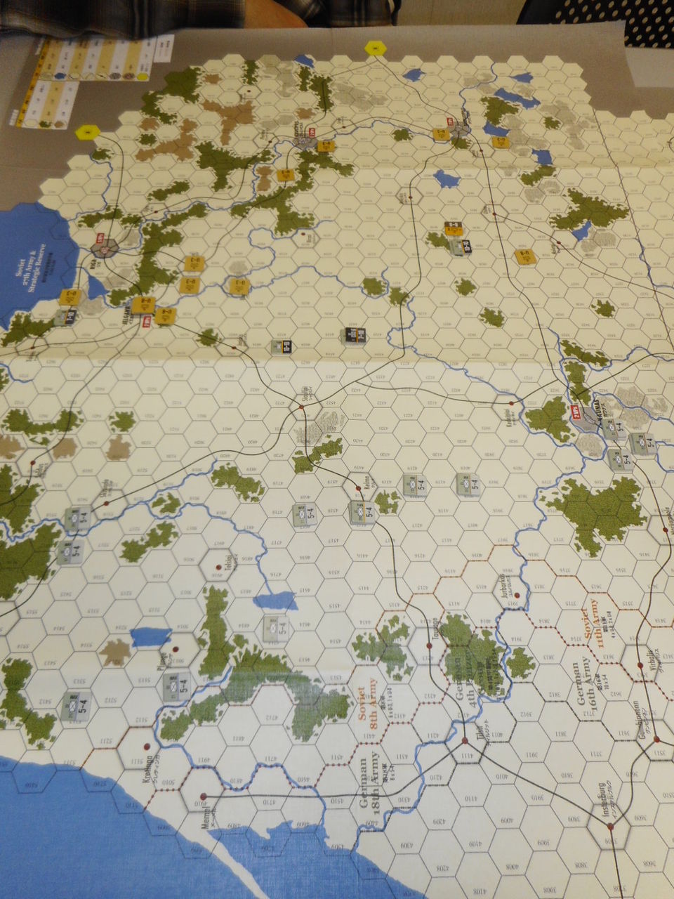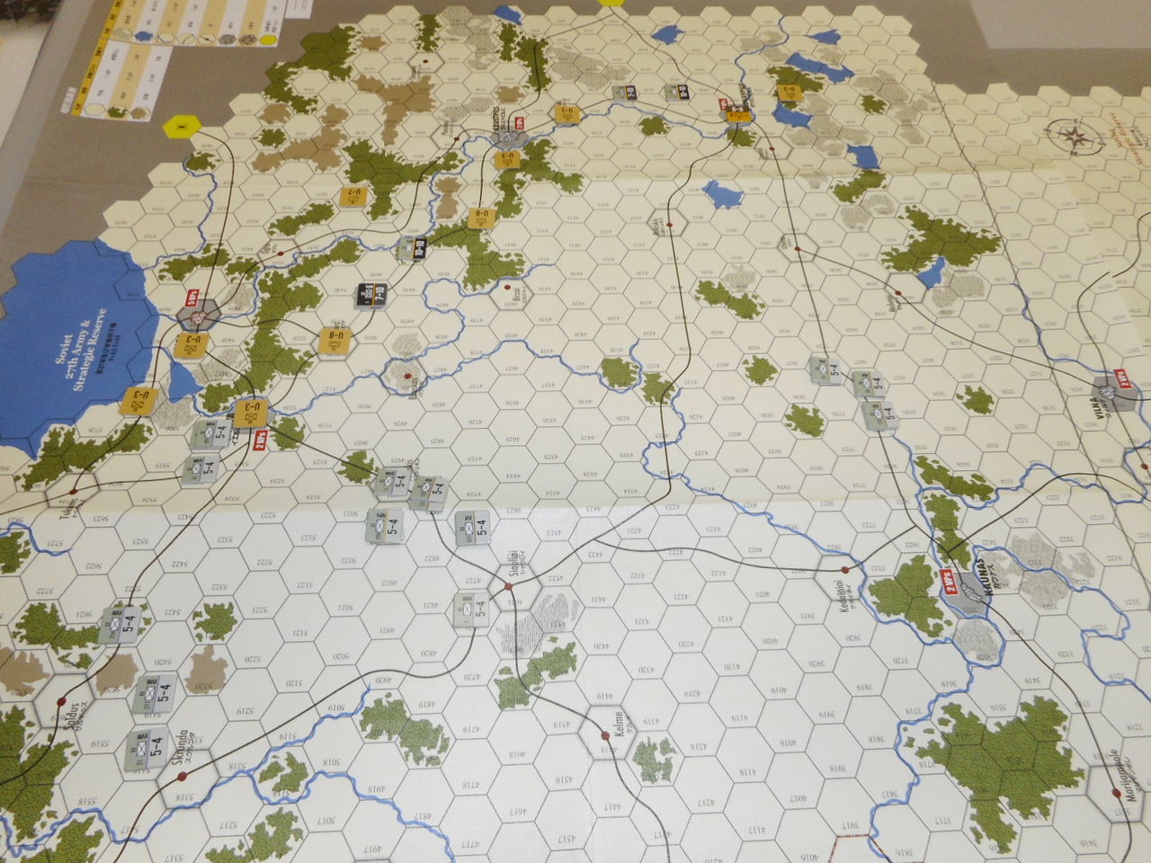 やっと、歩兵師団が追いついてきた第8ターン、ソ連軍はイエカヴァで自動車化師団に包囲攻撃を敢行。これがEXとなり、ドイツ軍の勝ちはなくなります。