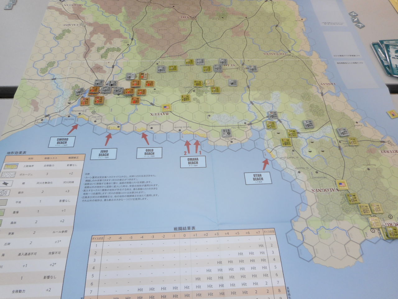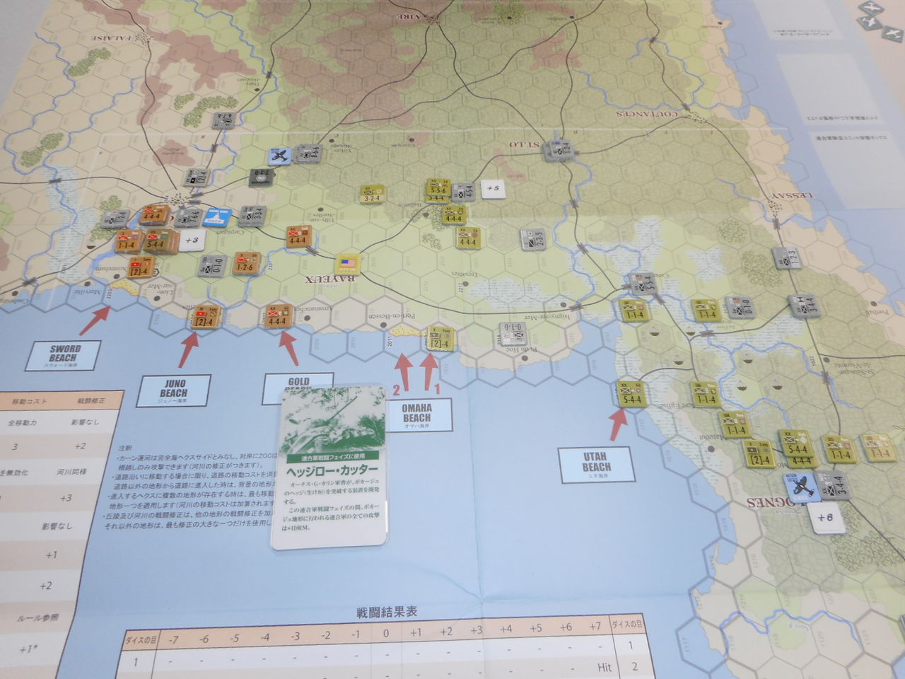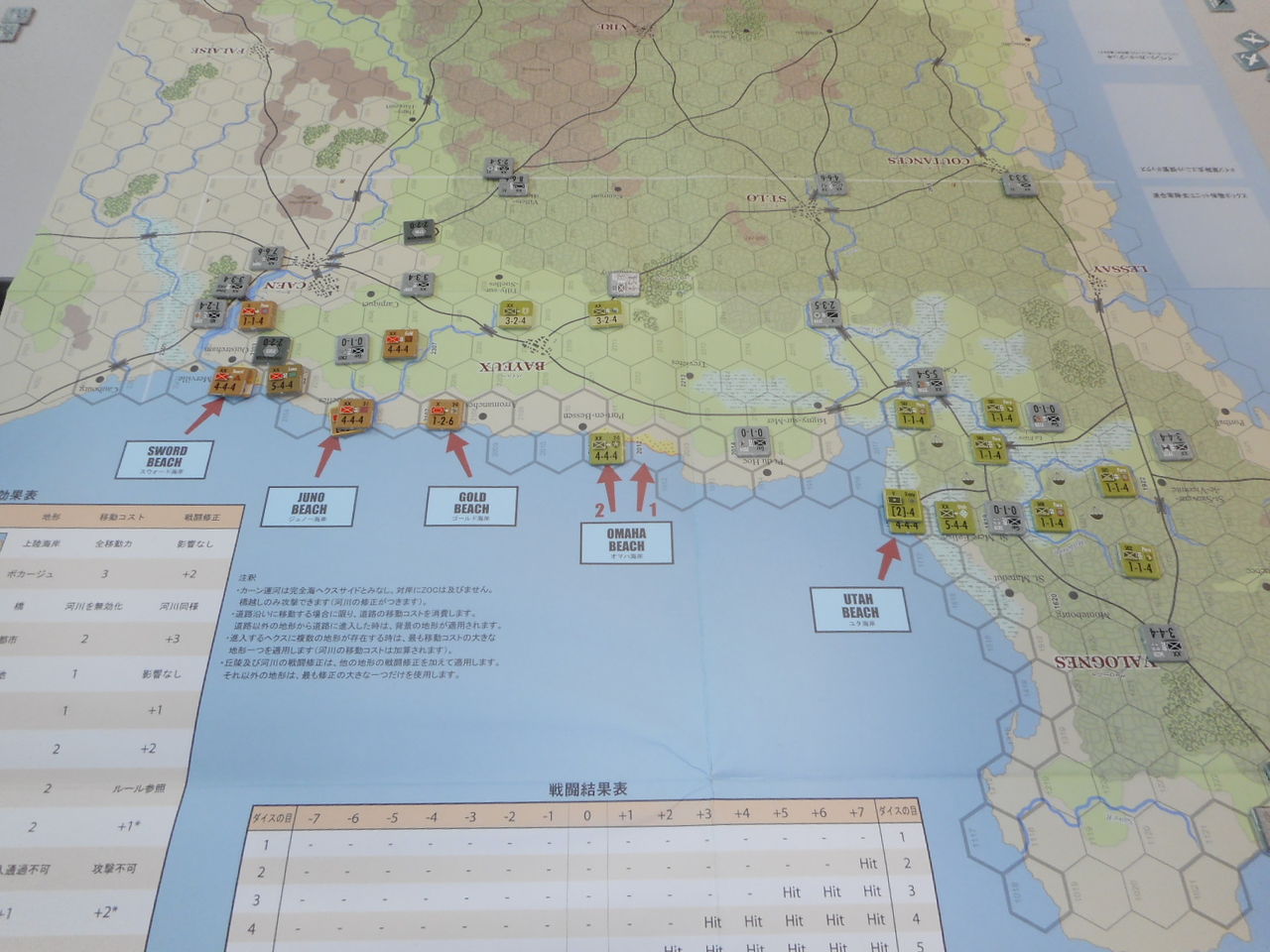 第1ターン、ドイツ軍は最強の3戦力要塞をオマハ海岸へ。その効果があって、占領には成功するものの2個歩兵師団がステップロスに。スウォード海岸では、第二次攻撃にも失敗し、上陸ならず。