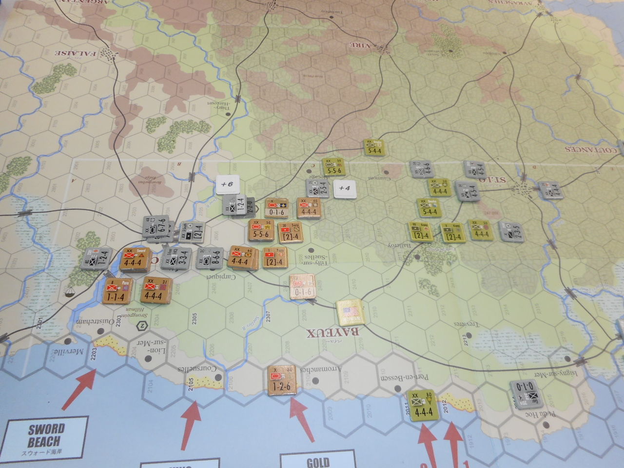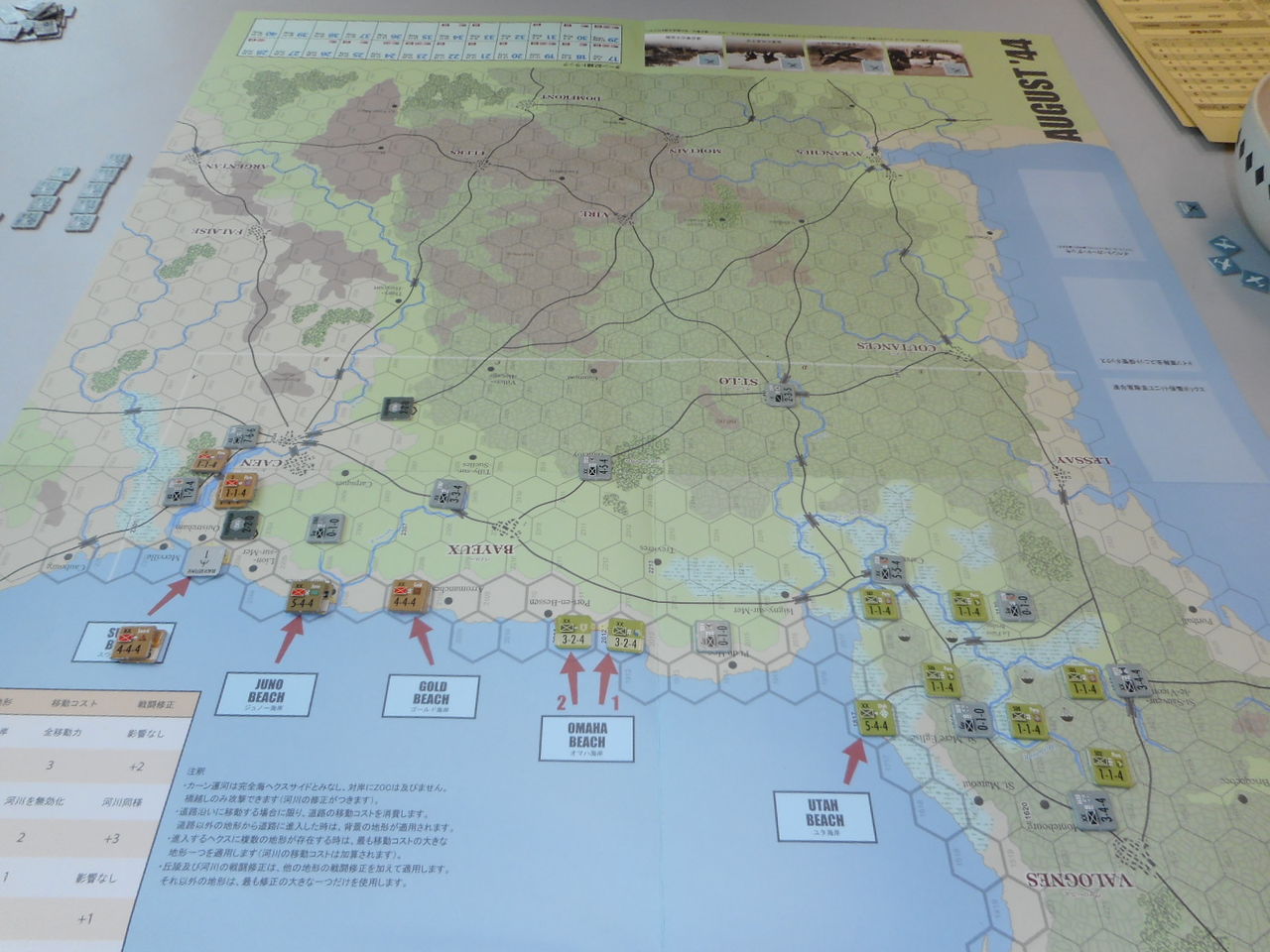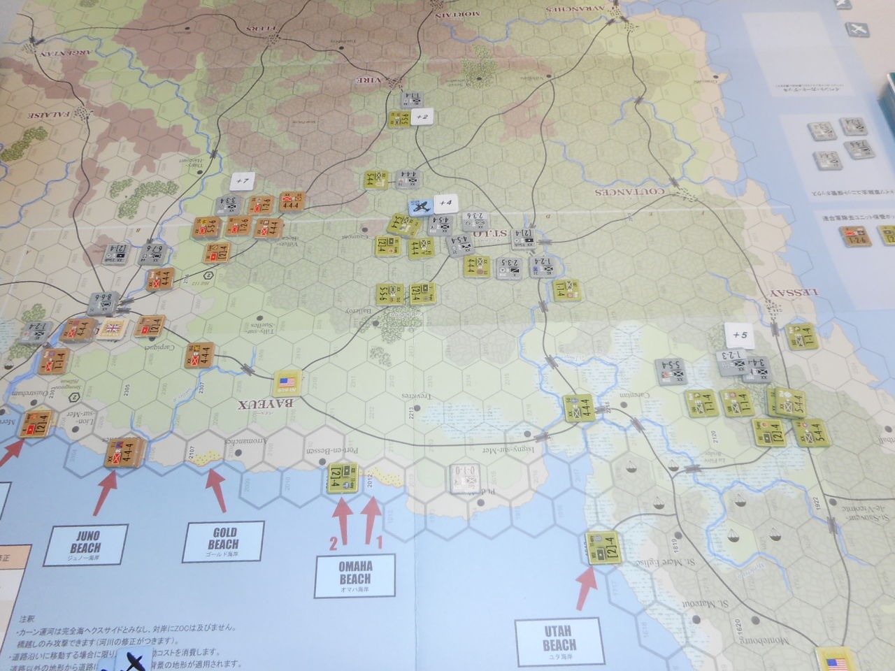 第1ターン、ドイツ軍は最強の3戦力要塞をオマハ海岸へ。その効果があって、占領には成功するものの2個歩兵師団がステップロスに。スウォード海岸では、第二次攻撃にも失敗し、上陸ならず。