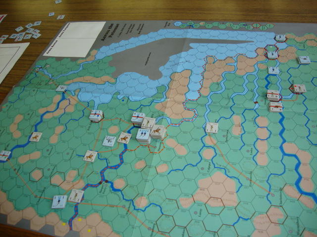 いわゆる「積み木の南北戦争」で、ガチンコの消耗戦となった東部戦線のキャンペーンです。戦力隠蔽型なので、どこの主力がいて、どこを狙っているのか、読み合いになります。