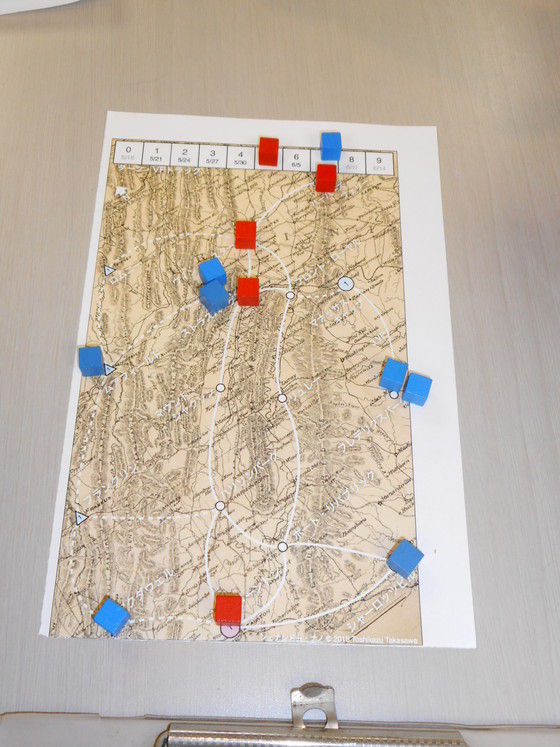 猿遊会主催のたかさわさんが、記念作品に作ったハガキのシェナンドウ戦役。数は少ないが優秀な南軍が、北軍を撃破していきます。まさに、石壁ジャクソン無双!デザイナー自らインストいただいた対戦が、非常に楽しかったです。