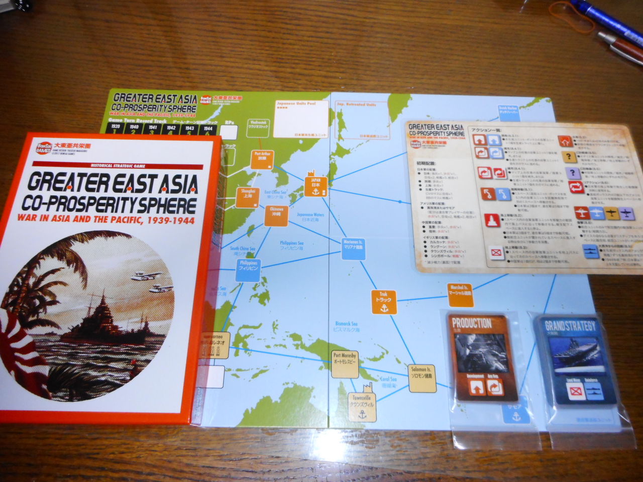 「本土決戦1945」と同様で、エリア式アルンヘムシステムに、CDSを組み合わせたアイテムです。その名の通り、太平洋戦争序盤の日本の進撃を描きます。日本軍は圧倒的ですが、その分、VPで調整していて、史実を上回るペースで占領をしていかいないと、勝てないそうです。