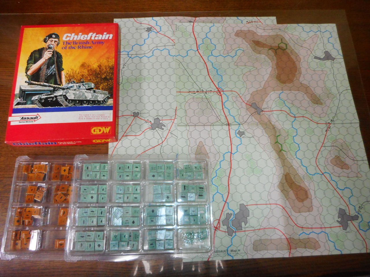 80年代の新興メーカーGDWが、鳴り物入りで発売した第三次世界大戦アイテムです。ユニットの単位は小隊ですが、正面とか側面とか、向きがあります。お互いの兵力が不明な状態でスタートするので、交戦までも偵察や兵力展開が味噌になります。戦闘自体は想定通り、破壊的だそうで。ソ連軍が突撃するためには、赤外線を通さない化学煙幕弾が有効です。