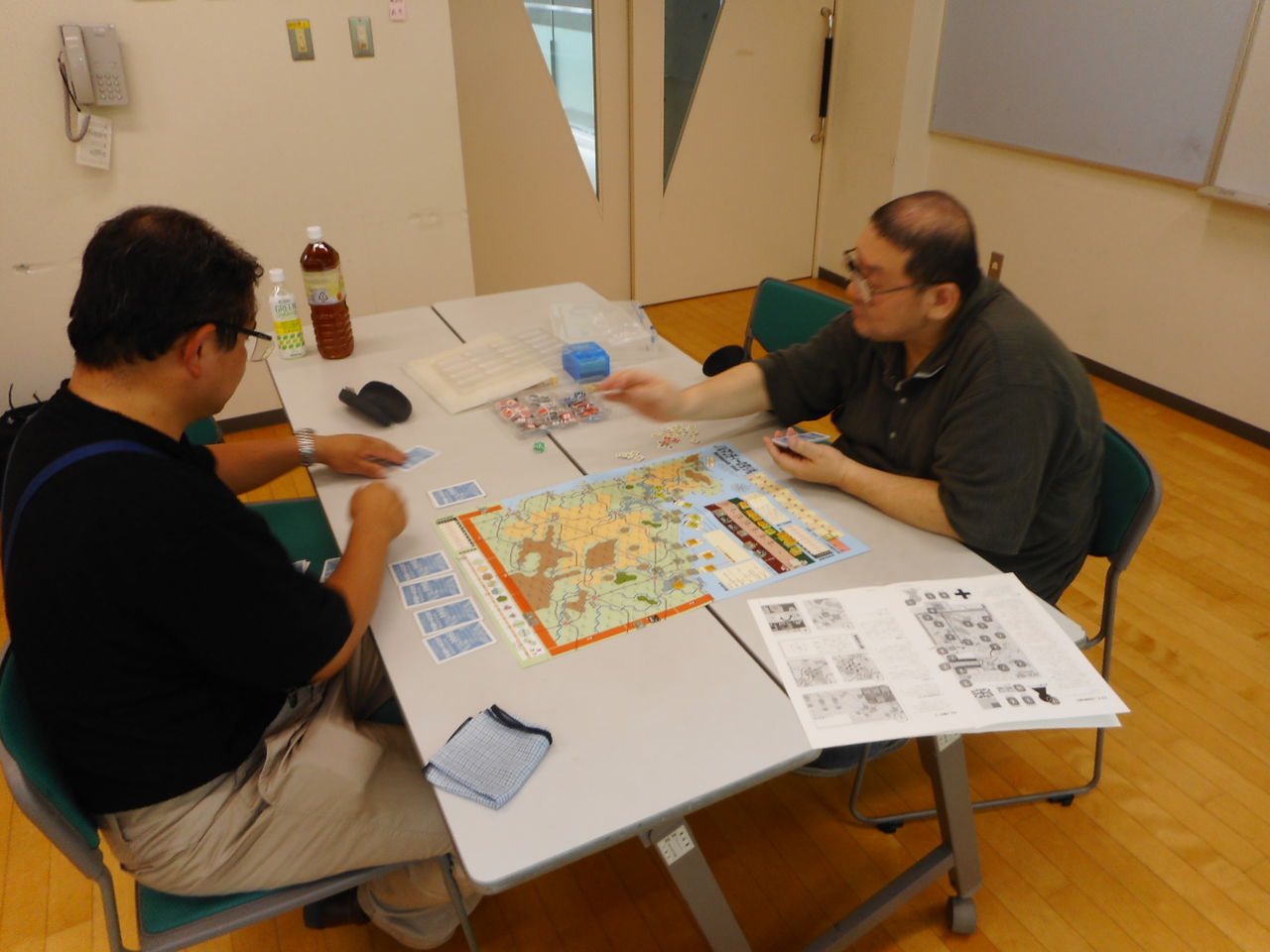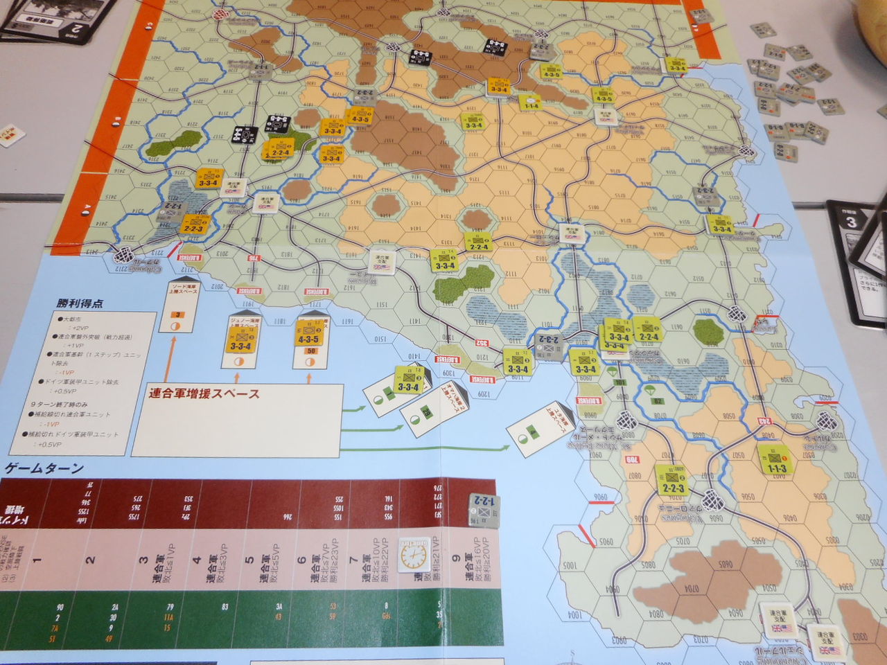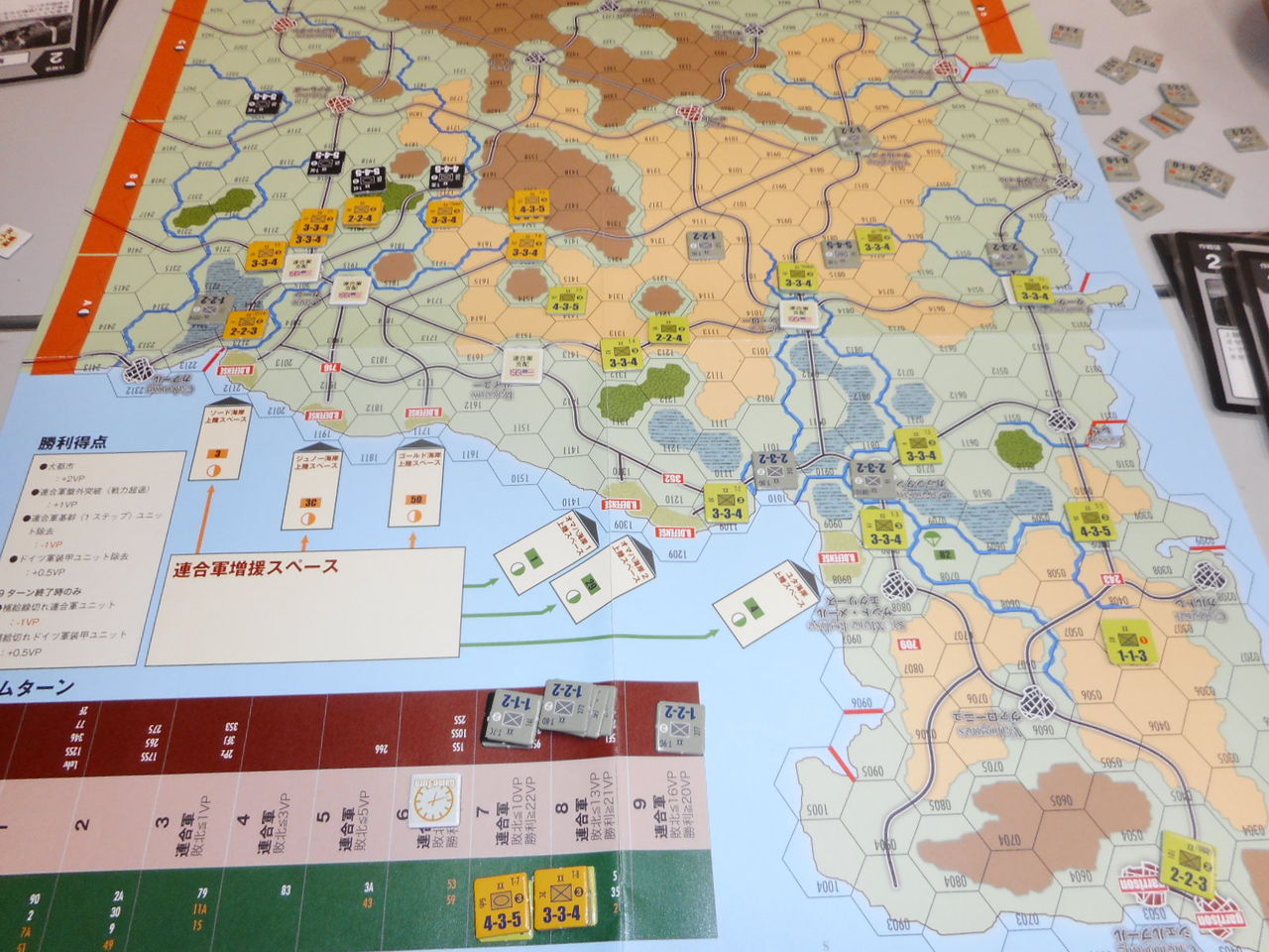 例会の最後に、Tommyさんをお誘いして、「ノルマンディの切り札」(CMJ)を対戦しました。陣営は、Tommyさんの希望でドイツ軍を、mitsuが連合軍を担当します。
