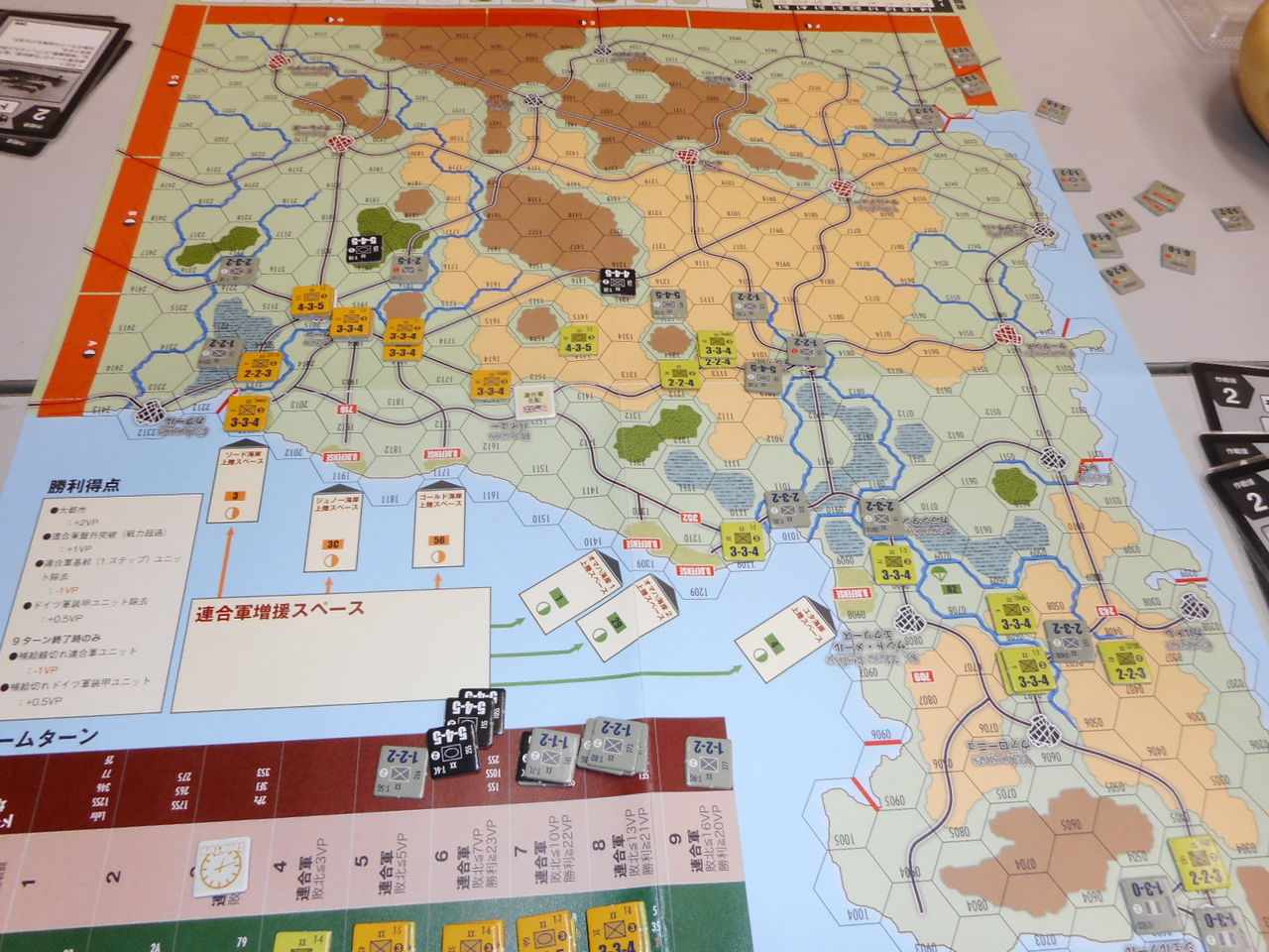 第8ターンには、一部の部隊を引き戻し、カランタンも奪取し、VPは23点を超えます。ドイツ軍も西から装甲師団を引き抜き、ビールの奪還を狙いますが、イギリス軍スタックががっちり守って寄せ付けず。そのまま、サドンデスで連合軍の勝利となりました。