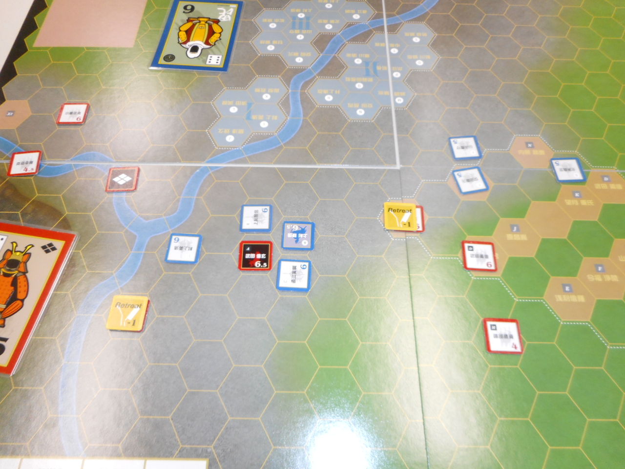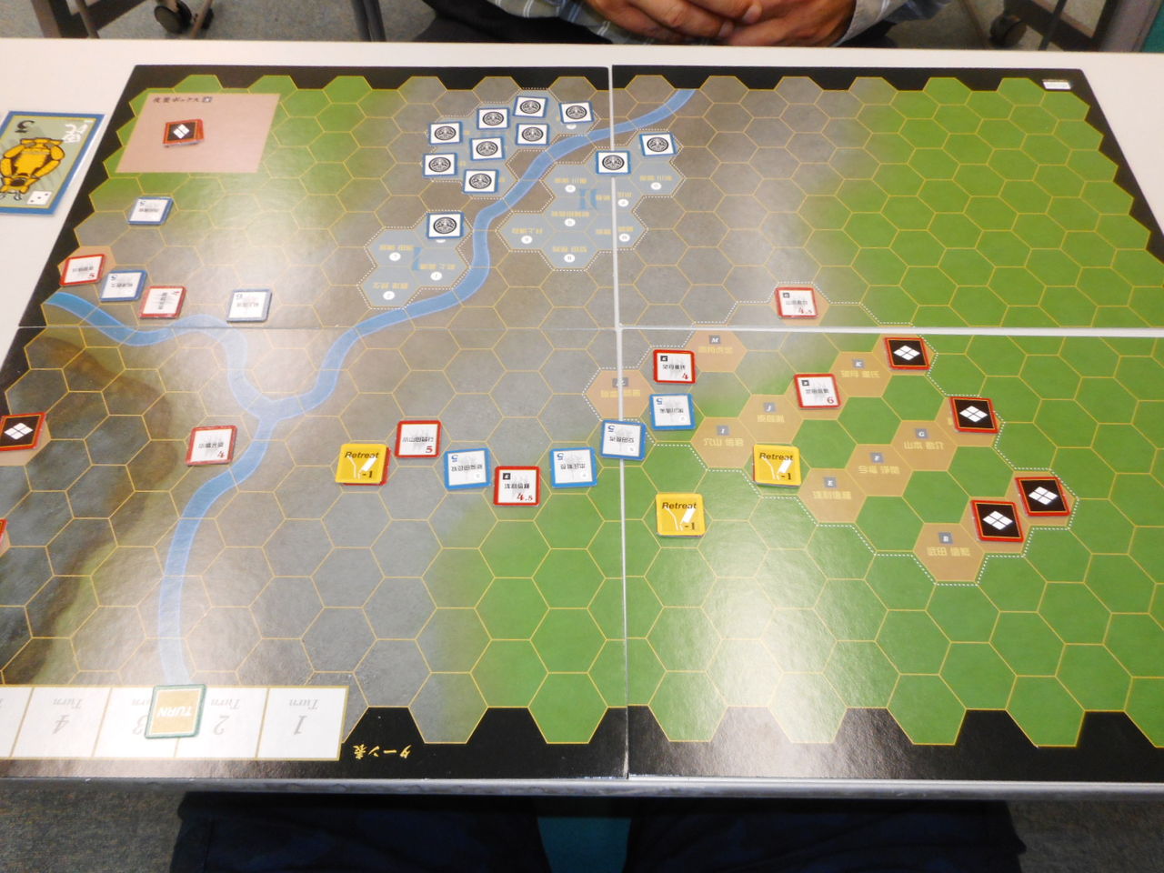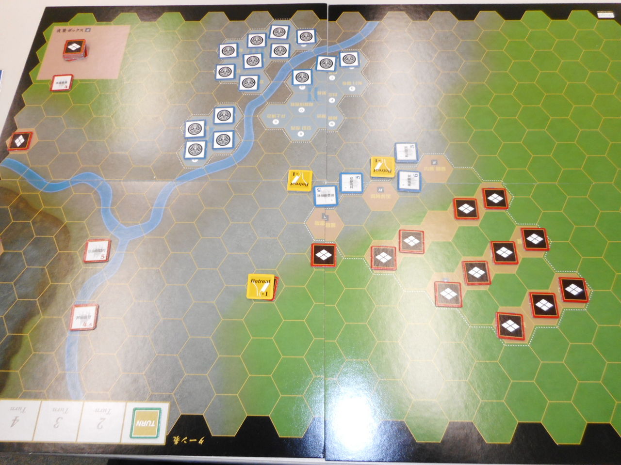 第4ターン、武田勢は本隊ごと南西方向に移動し、一部、妻女山攻撃隊と連結をします。が、中央部には1ユニットながら強力な村上義清隊が残っており、謙信本隊も中央部に迫ってきます。損害は戦力で劣る武田勢に多いものの、数を生かしてVP的にはほぼ互角です。 第5ターン、ここを凌げば数で優勢に立てる武田勢でしたが、上杉勢もそれを熟知しており、最後の猛攻をかけます。まず、直江隊が中央部にいた穴川隊を粉砕し、突破します。武田勢は起点となる村上隊を粉砕し、脱出路を開こうとしますが、あいにく敗走。包囲下に置かれた信玄本陣に上杉本隊が突入!これに勝利して、見事、信玄を討ち取り、サドンデス勝利となりました。 お互いにカードを出し合うシステム故、読みが外れると極端に展開が動くので、そういった意味ではリプレイアビリティは高いです。ただし、エンターテイナーの銀一郎氏らしくゲームとしては面白いですが、戦力が変動する戦闘解決は「なにをしみゅれーとしているんですか?」かなと。