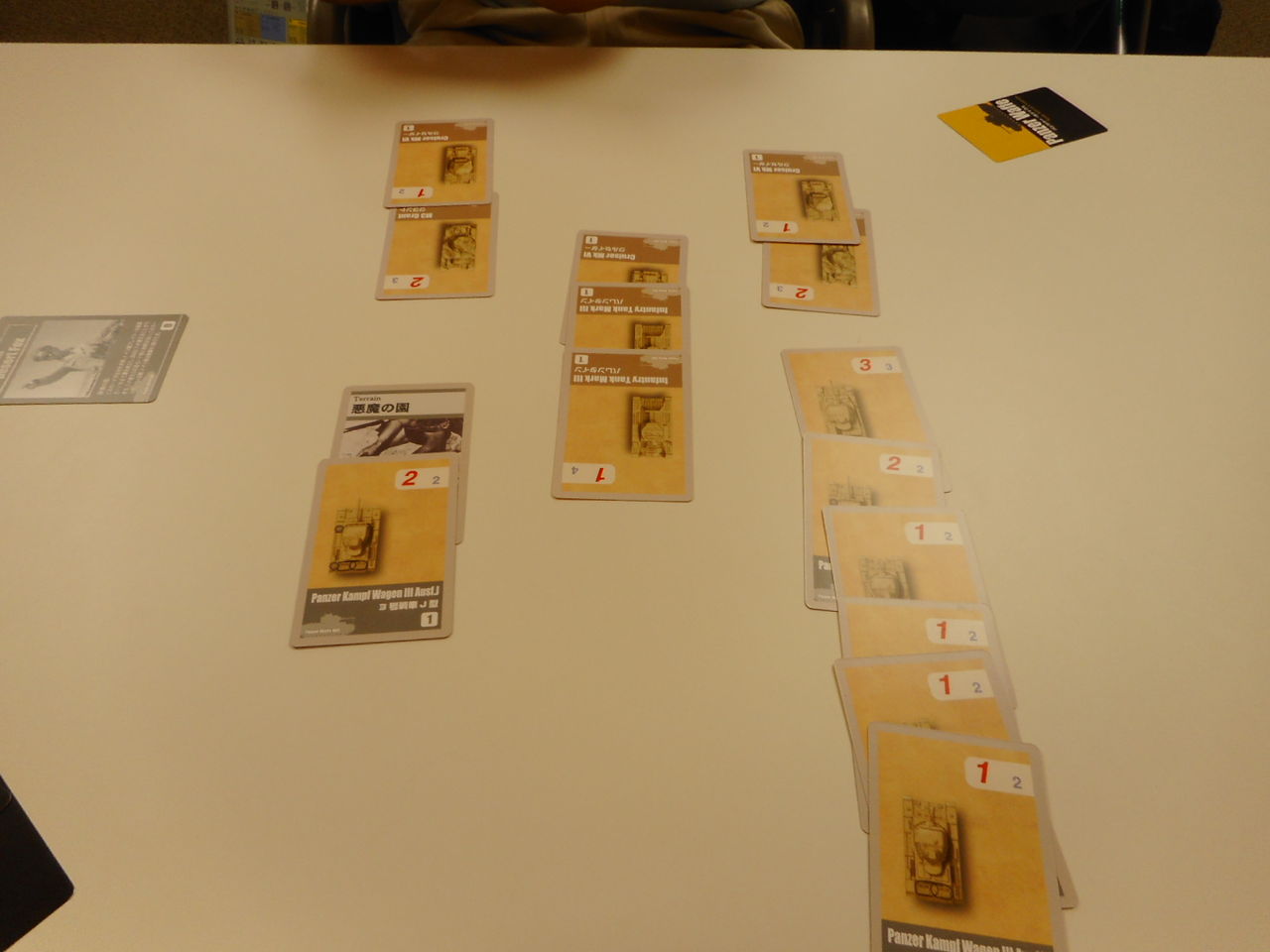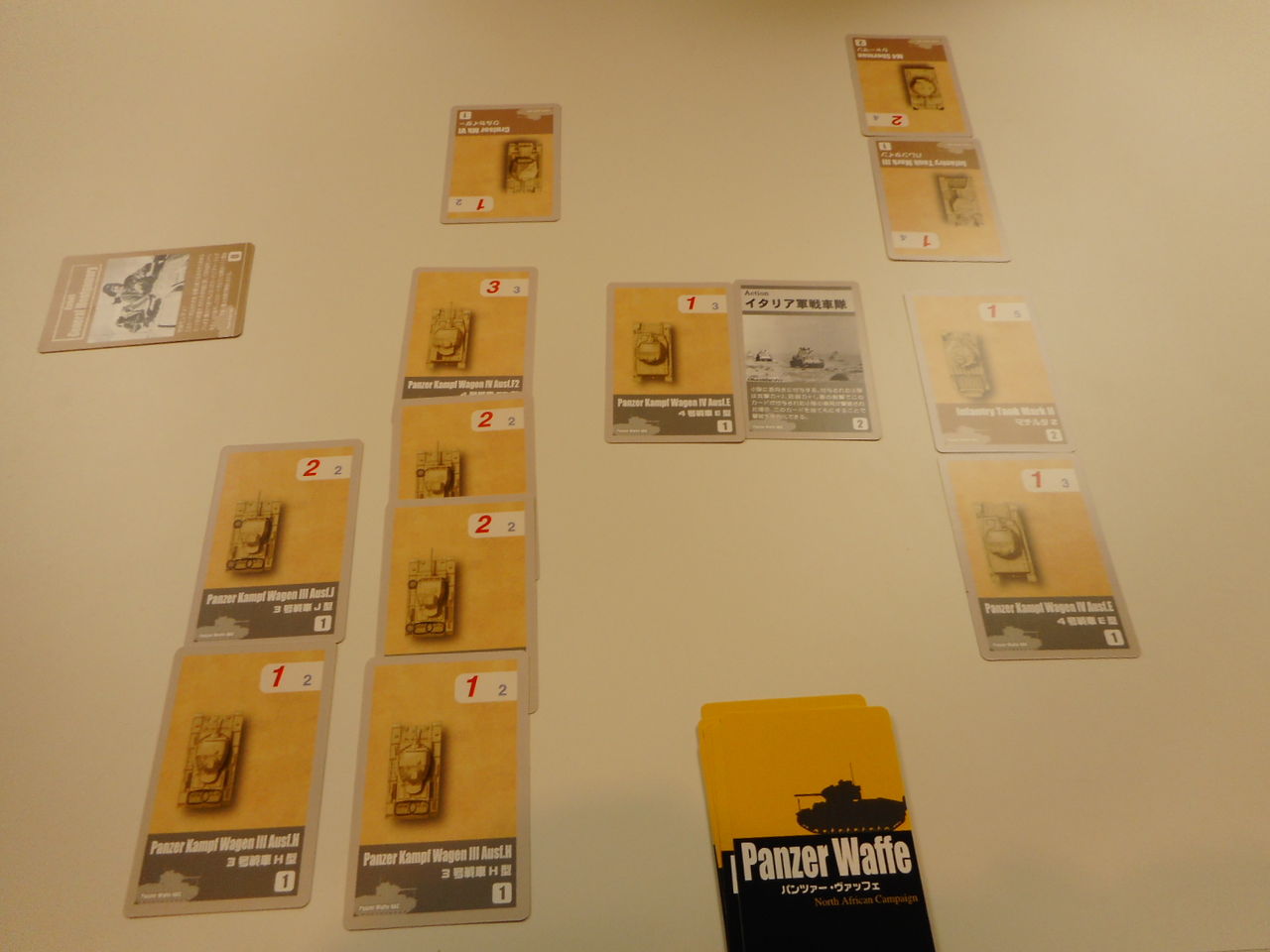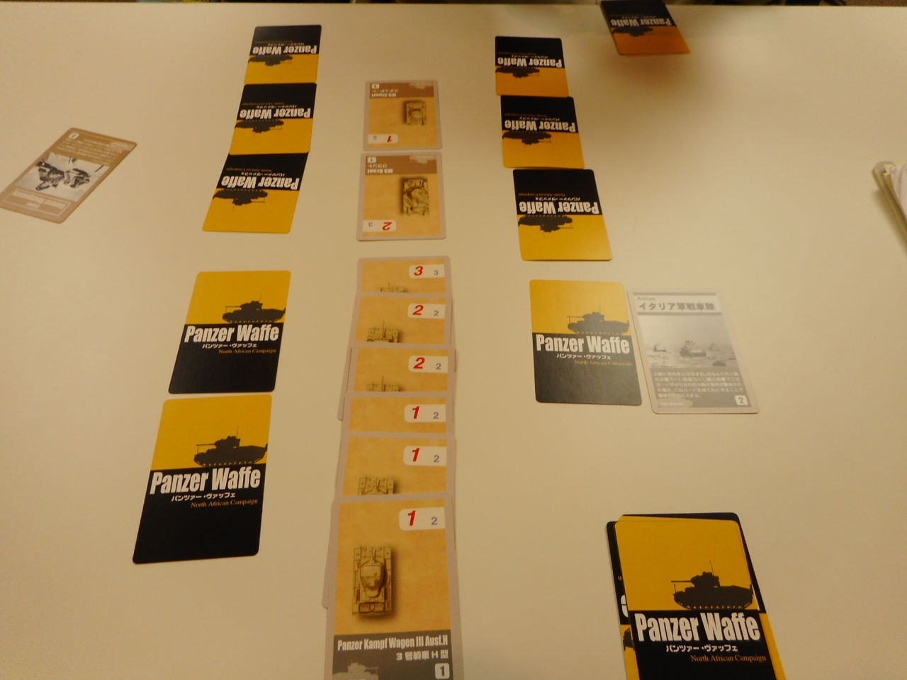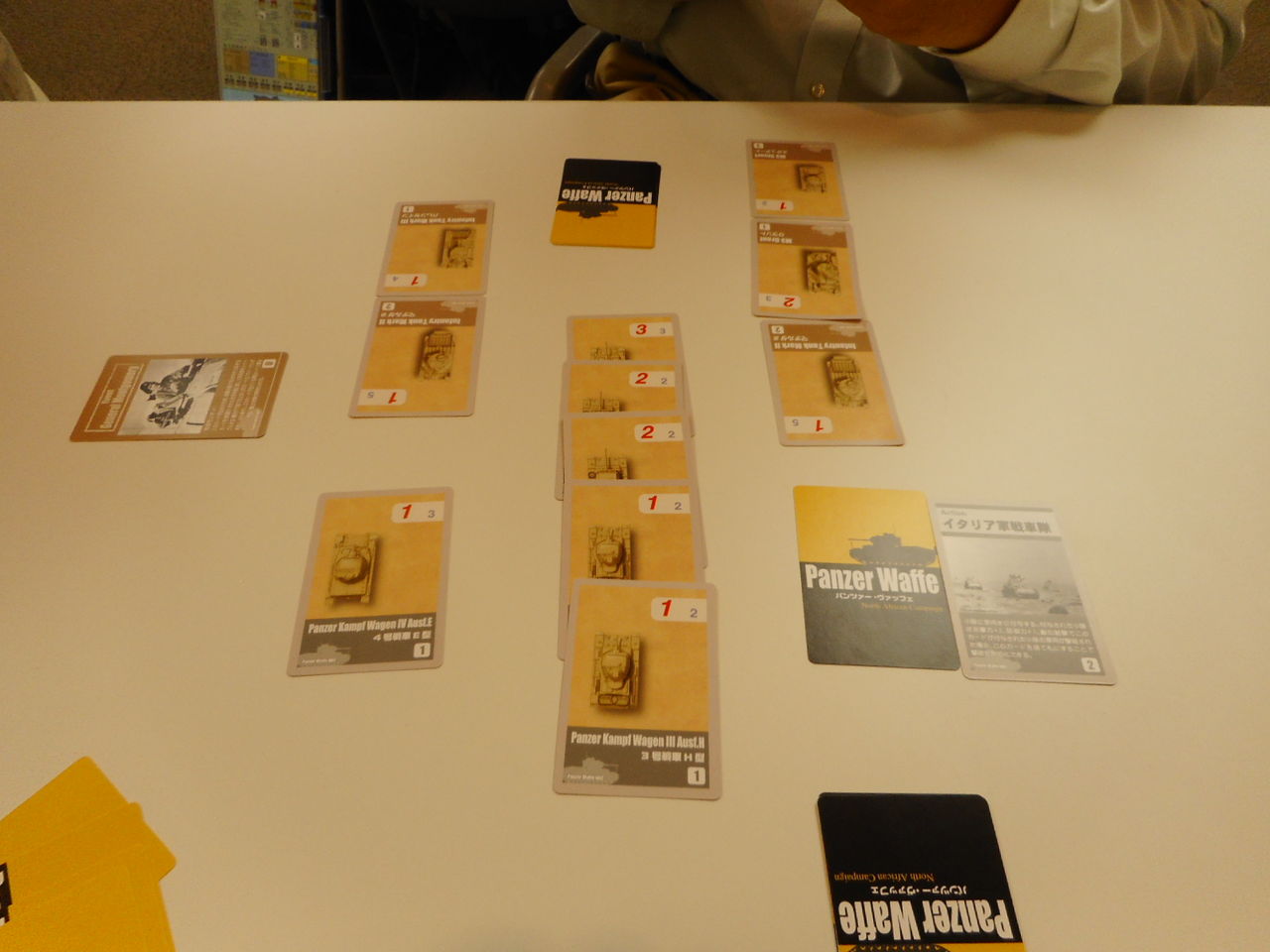午後になって、都内の知り合いの方がぽつぽつと参加されまして。奥津城さんも来たのですが、あまり時間がないということでしたので、簡単にいける「PANZER WAFFE North Africa」(CMJ)を対戦しました。陣営は、ドイツ軍(mitsu)対イギリス軍(奥津城)です。