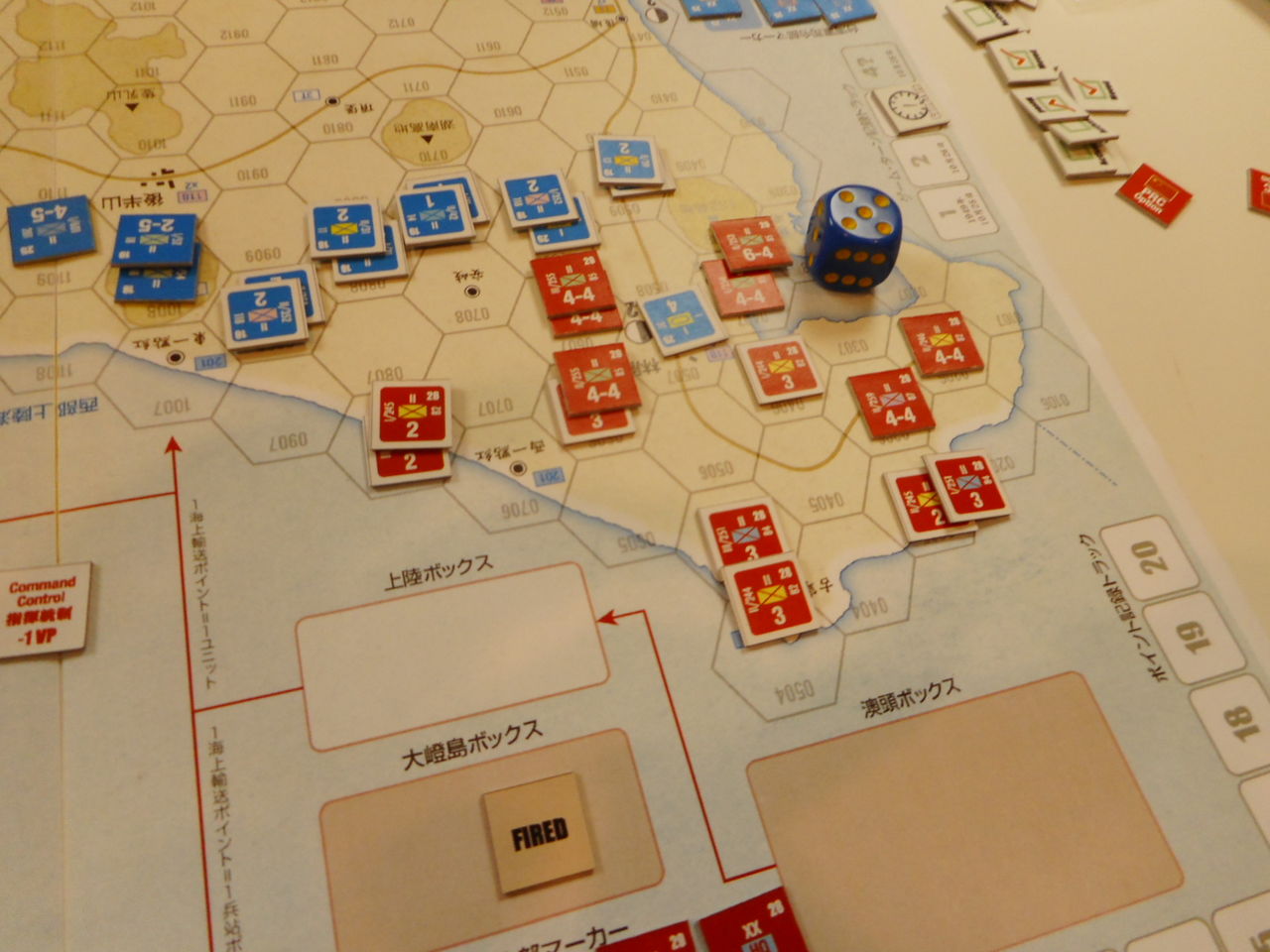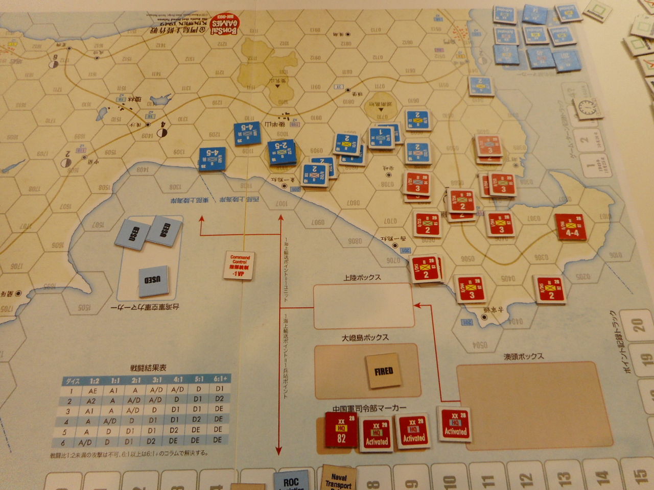 特別ルールとしては、台湾軍には空爆が、人民解放軍には砲撃があり、任意の1ユニットを混乱にできます。また、人民解放軍には、砲撃の強化や共同攻撃可能、海上輸送ポイントの増強など、戦術チットが3枚有り、ダミーと合わせて6枚から3枚を引きます。どれも効果は大きいですが、使用の度に1VPを失います。ちなみに今回のチットは、ダミー2枚と共同攻撃可能でした。