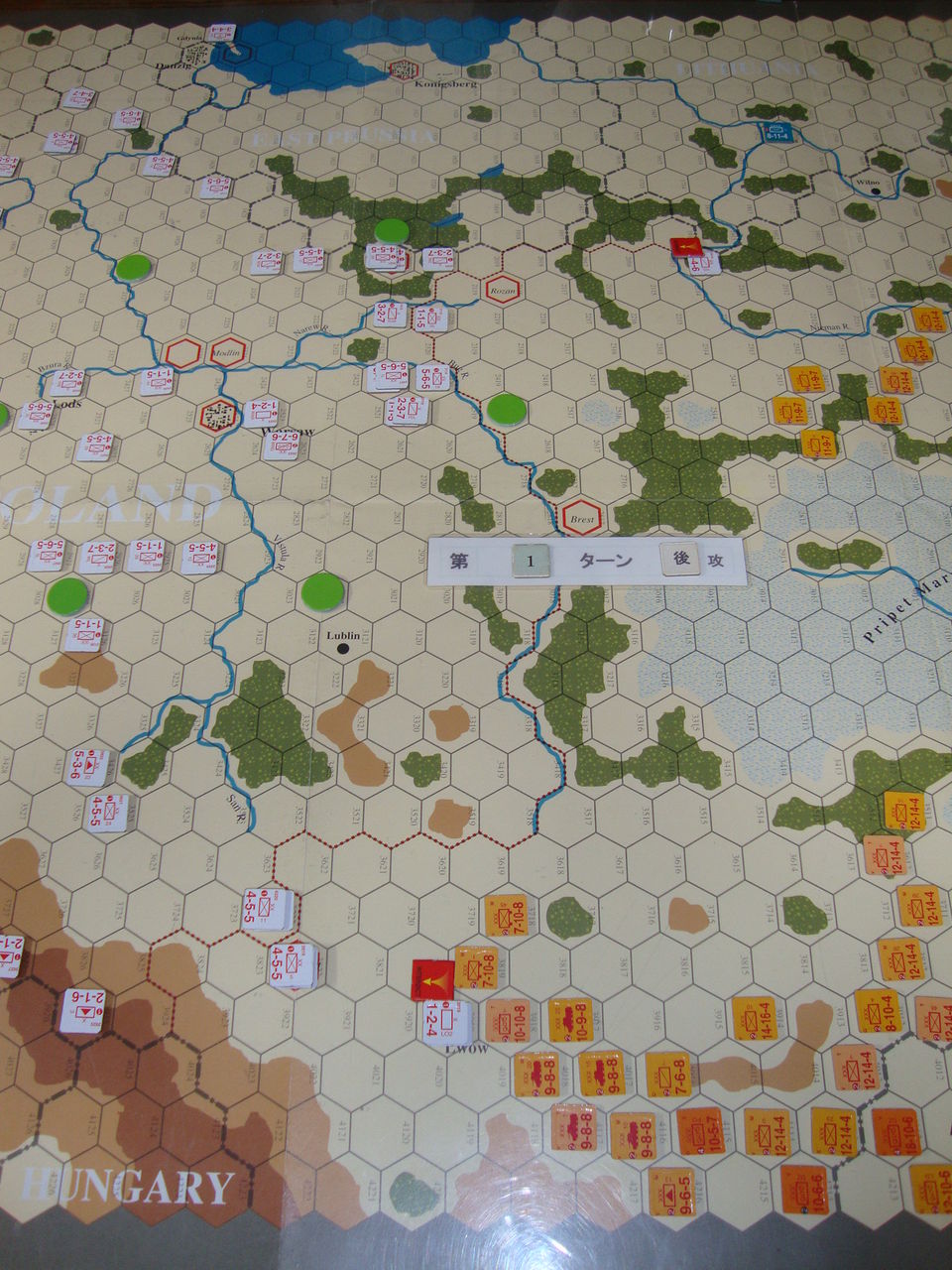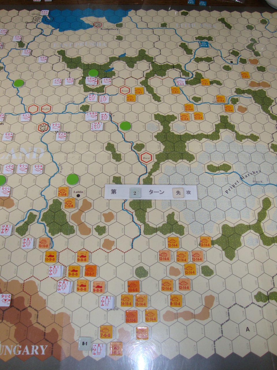 第2ターン、突進するソ連軍は、逃げ遅れた敵を包囲殲滅しながら、サン川南方を越えます。一部の部隊は、ルブリン経由での迂回を試みます。ここで、全面的な攻撃もできましたが、後の激戦に備え、損害の少ない高比率戦闘のみを行います。