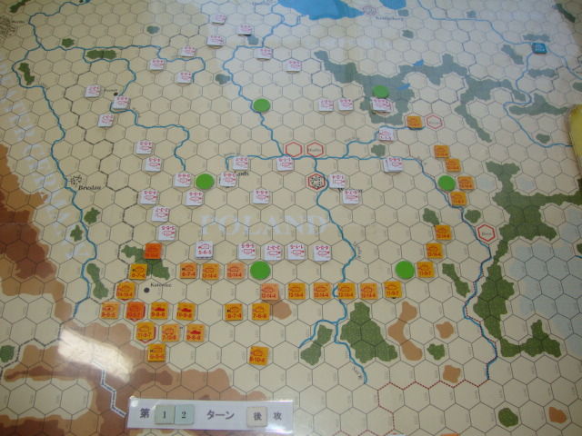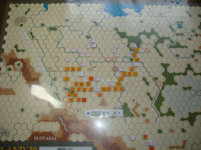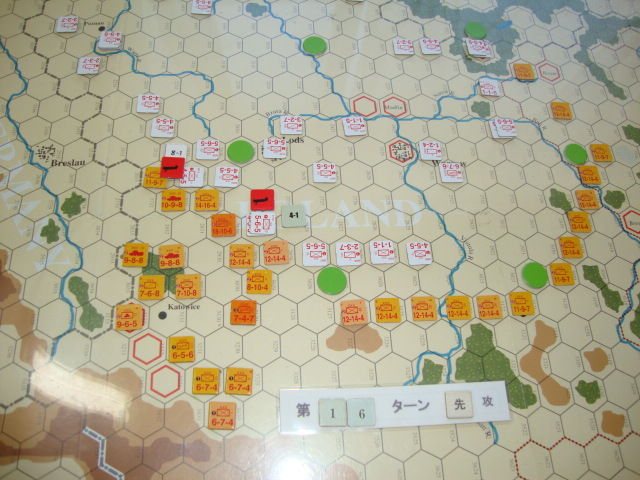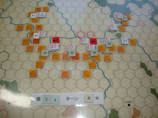 が、第12ターン、さすがに度重なる強襲により、ポーランド軍の予備が底をつきます。ついに主力部隊に対して、3:1攻撃が可能になり、ポーランド軍はじりじりと後退を始めます。