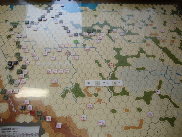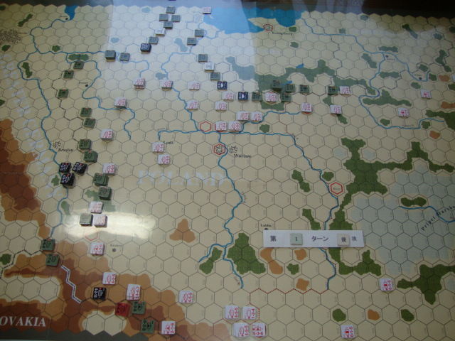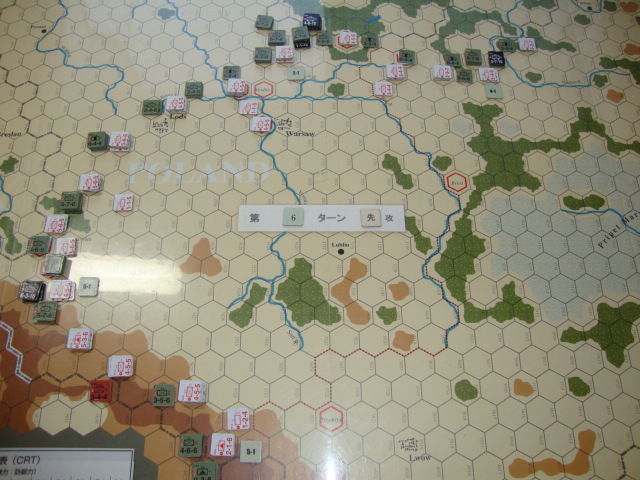 第1ターンは特別ルールのため、基本的に従来の展開と同じです。ドイツ軍は無駄な攻撃を控え、敵を包囲できる3カ所でのみ、攻勢をかけます。結果、ポーランド軍6ユニットが包囲拘束されます。