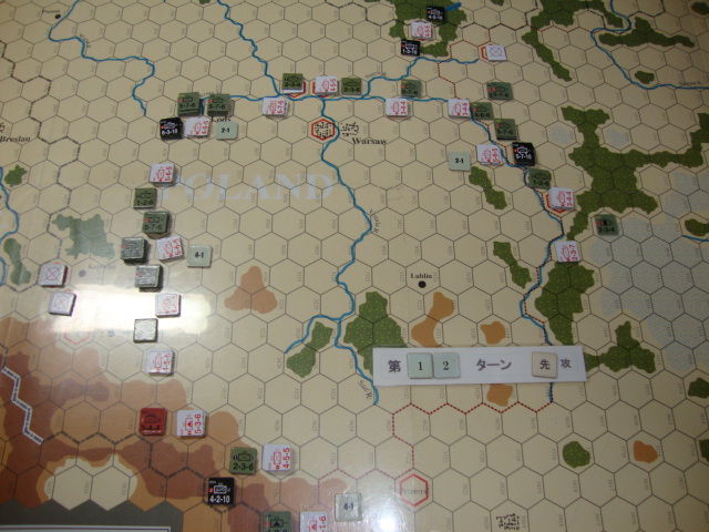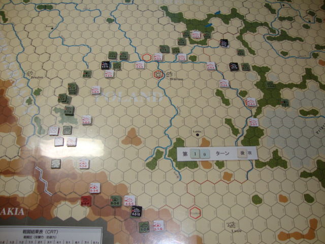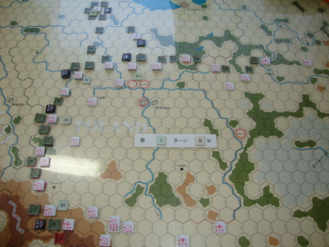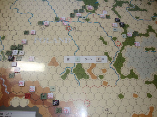 第4ターン以降、強襲に強襲を重ねるドイツ軍ですが、Mlawa-Modlin-Lods-Krakowの堅陣で迎え撃つポーラン軍を全く抜けず。損害は与えるもの、後方からの補充で、すぐさま増強され、不毛な消耗戦に巻き込まれます。ああ、電撃戦の戦略を持たないドイツ軍は、こんなにも苦労するのか!