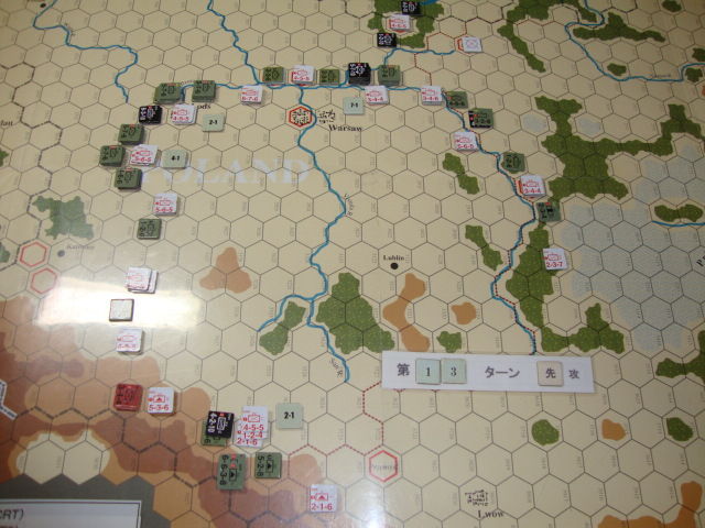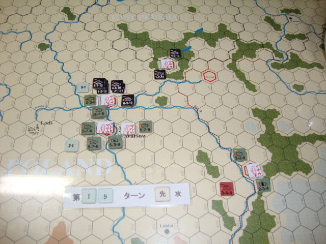 第13ターン、ここまでの鬱憤を晴らすように、ドイツ軍は逃げる敵を追撃します。中央では、まず、Warsawへの関門のLodsを包囲攻撃し、2ターンでこれを占領します。また、補給切れで動きが鈍ったポーランド軍を、ドイツ軍の快速部隊が捕捉し、第16ターンまでにLwow方面を平定します。しかし、ドイツ軍に残された時間は、後4ターンしかありません。