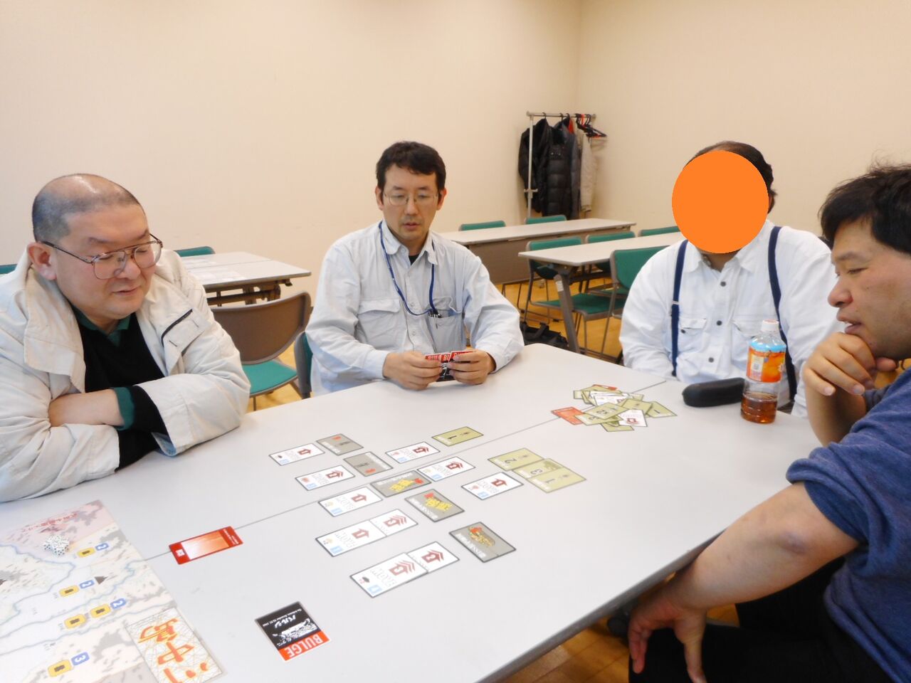 みなさんが集まり始めたところで、ゲムマで手に入れたばかりの最新カードゲーム「バルジ」(CMJ)を対戦しました。協力型のマルチゲームで、プレイヤーは連合軍の各指揮官となってドイツ軍の攻勢を押しとどめることになります。