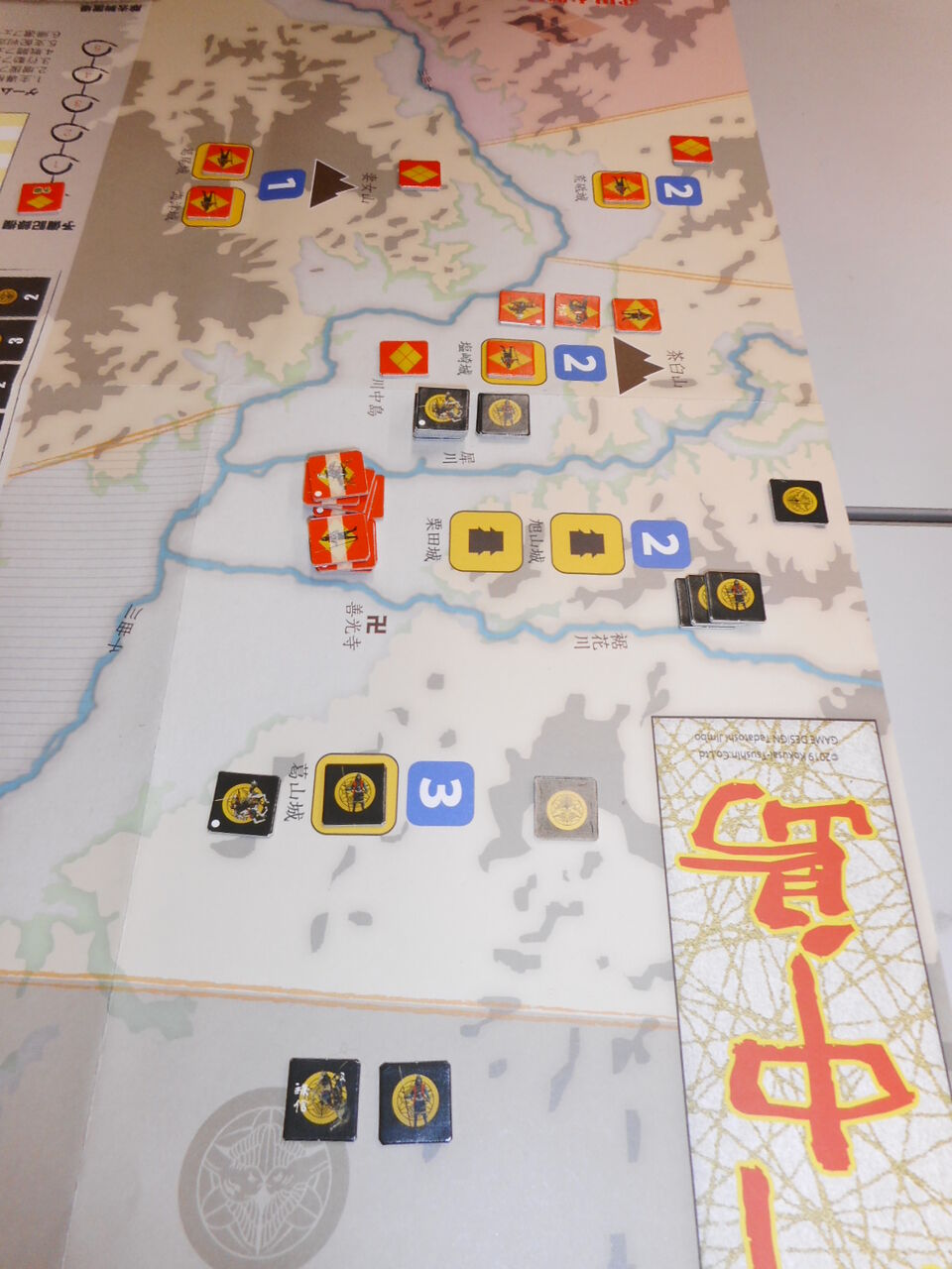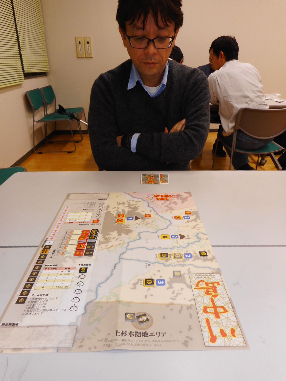 第1ターン、上杉軍は先制攻撃とばかりに、川中島に繰り出します。当然、武田も迎え撃ち、距離が近い分、兵力は武田に分があります。さらに、戦闘が始まると、武田軍は「魚鱗」カードを使用します(防御がヒットに変化)。消耗戦となり、上杉が厳しくなったところで、今度は上杉軍が「一騎打ち」カードをプレイ。これにより、川中島は中立となり、上杉軍に+2VPとなります。 勝っている上杉軍は、当然、行動を自重し、消耗した部隊を回復させながら、前線を固めます。武田軍もこれに合わせ、戦闘は仕掛けて来ず。と、あっという間に、最終第5ターンに。武田勢は、VPを挽回せんと上杉領に進攻してきます。敵を十分引きつけたところで、上杉軍は「鞭声粛々」を使って、8部隊が急遽、川中島に転進します。山地で守っているとは言え、武田軍は4ユニットで、圧倒的に有利なはずでしたが・・・ああ、武田騎馬軍団が大活躍し、強制退却の6を連発!上杉軍も粘って、最後は信玄と上杉隊の1対1になりましたが、敗北。上杉領に進攻した部隊も勝利し、武田軍が見事に逆転勝ちとなりました。