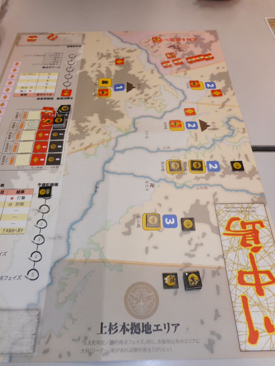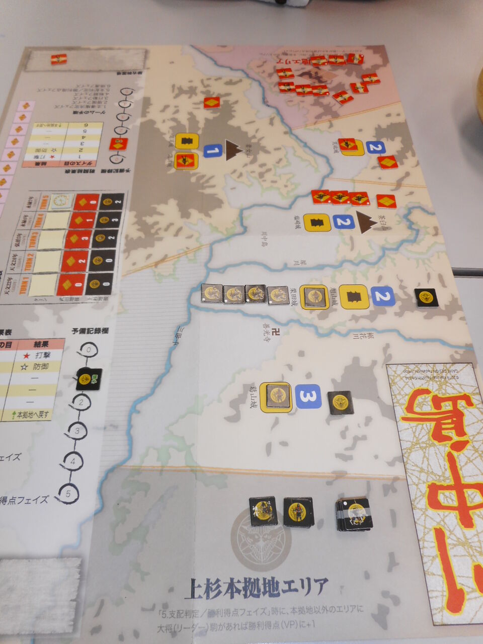 気を取り直して、第2戦に。今度は両軍とも守りを優先し、第1ターンのVPはイーブンに。第2ターン、上杉軍が仕掛けます。大胆にも謙信が荒砥城へ進出。と、信玄が圧倒的戦力でこれを迎え撃ちます。ここでカード「一騎打ち」。これにより、両軍は撤退し、上杉が2VPとなります。 武田軍はこれを跳ね返そうと、第3ターンに旭山城に侵攻しますが、今度は休養十分の上杉軍に蹴散らされ、4ユニットを失い、敗退します。 第4ターン、敵兵力の減少を見て取った上杉軍は、河川越え罰則なしのカードを利用し、先手を打って、川中島へ。武田軍も回復カードを駆使して部隊を復活し迎撃しますが、損耗部隊が多く、ユニット数は同じでも上杉軍が有利か。戦闘開始とともに激戦となりますが、上杉軍の精鋭が損害を受け止め、徐々に武田軍不利に。そのまま、上杉軍が押し切り、勝利の勝ちどきを上げ、VPは4ポイント差に。 損耗した武田軍にこれを押し返す力はなく、最終ターンはイーブンのまま、上杉軍のVP勝利が確定しました。drによる展開の振れはありますが、カードの使用や部隊の展開など、選択肢が多く。かつ、30分もあれば、1プレイが終わるので、ローテにはもってこいですね。