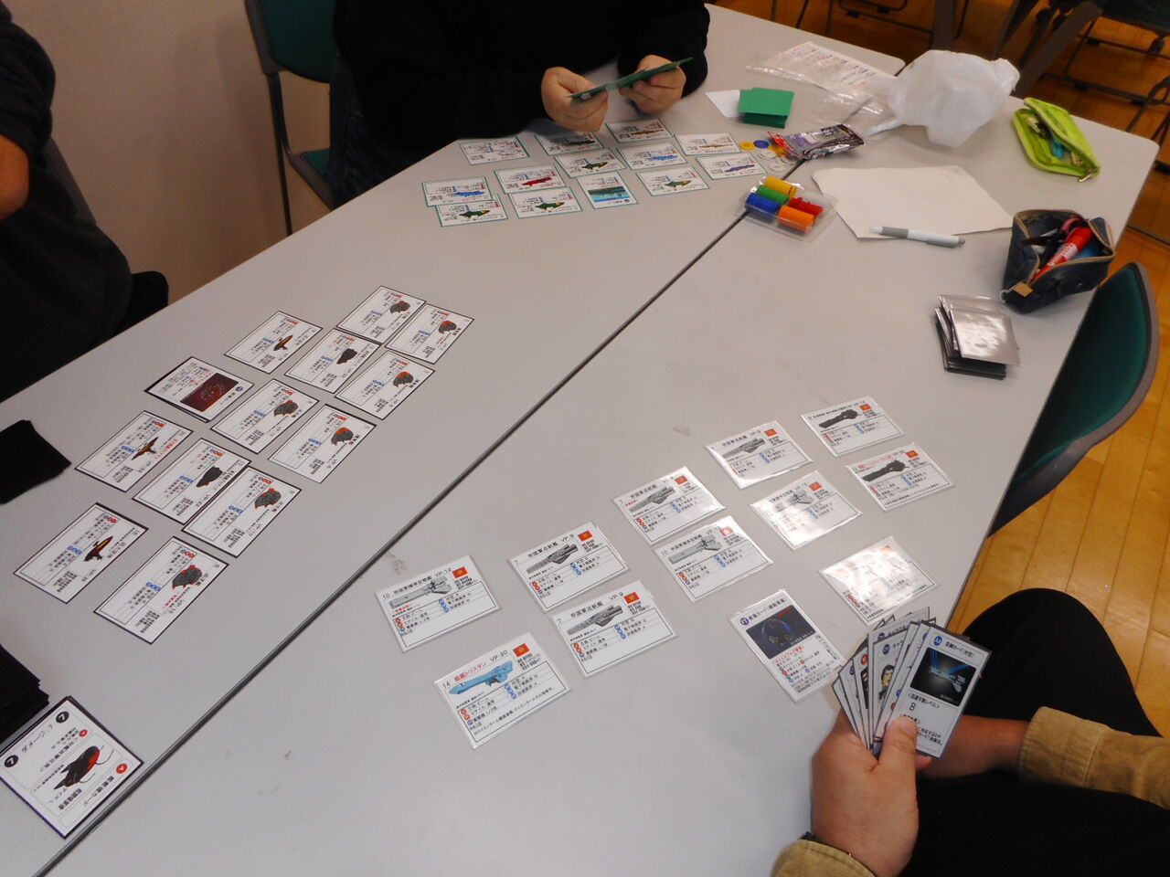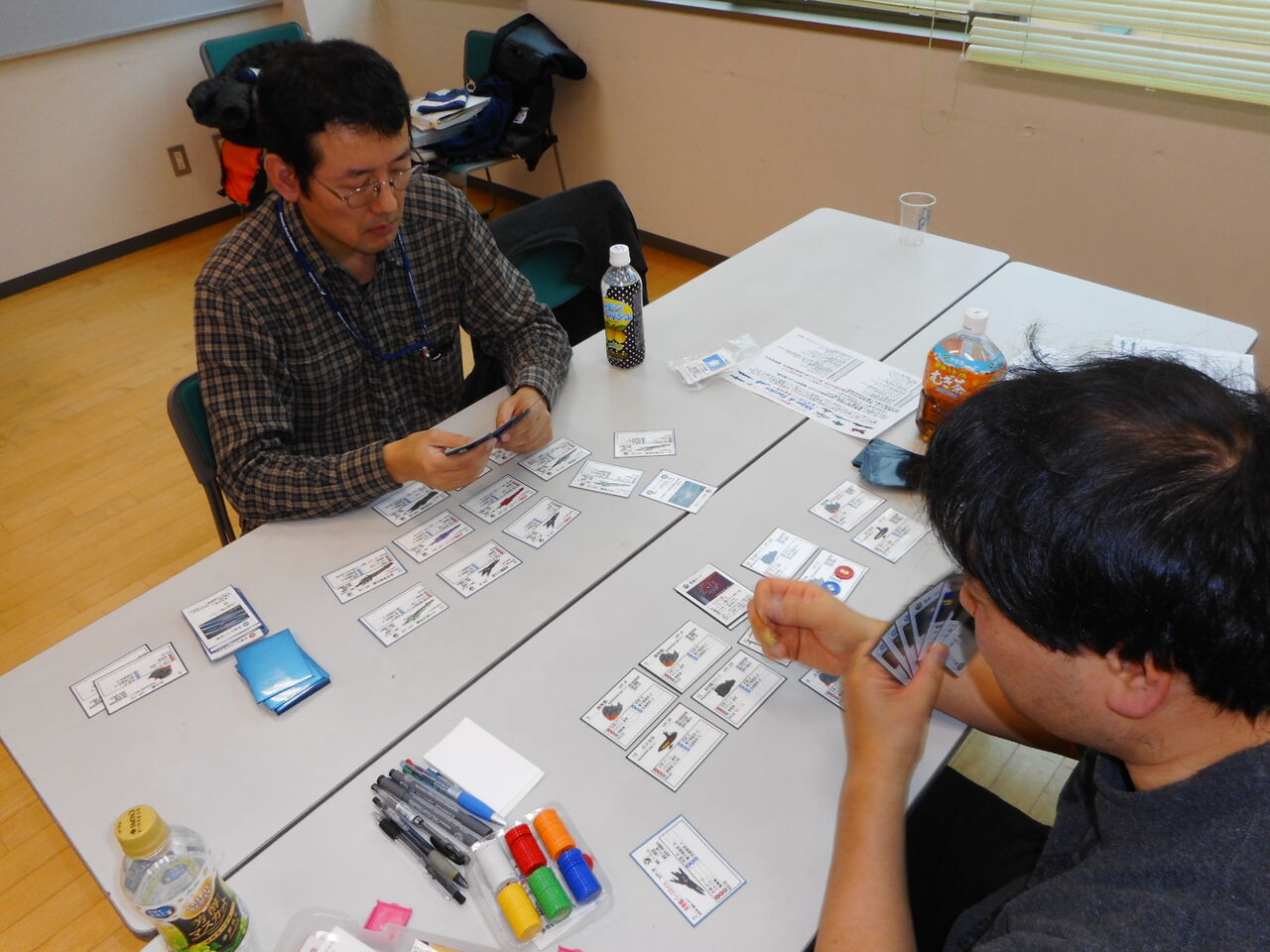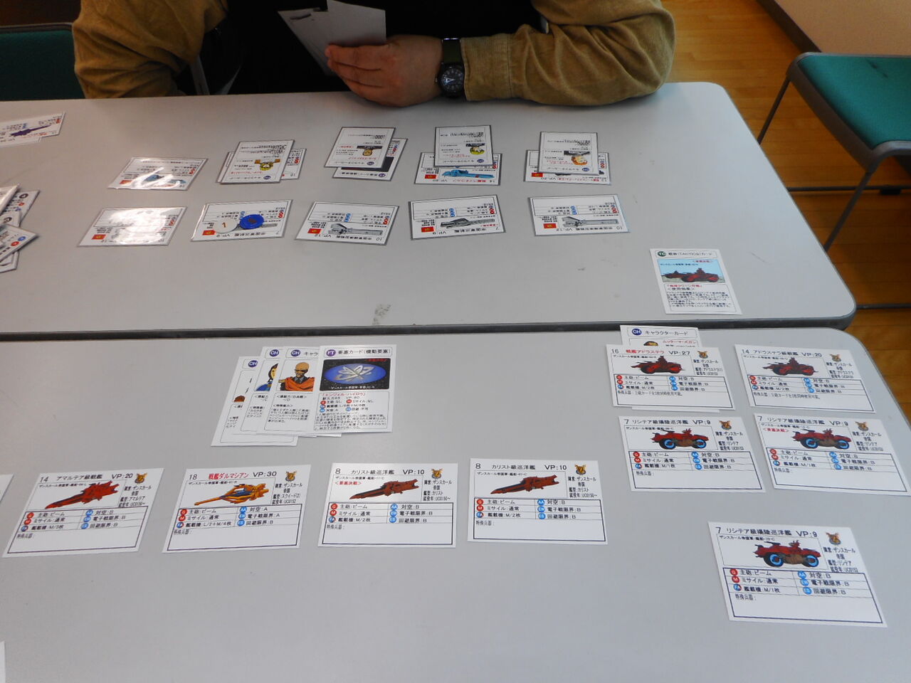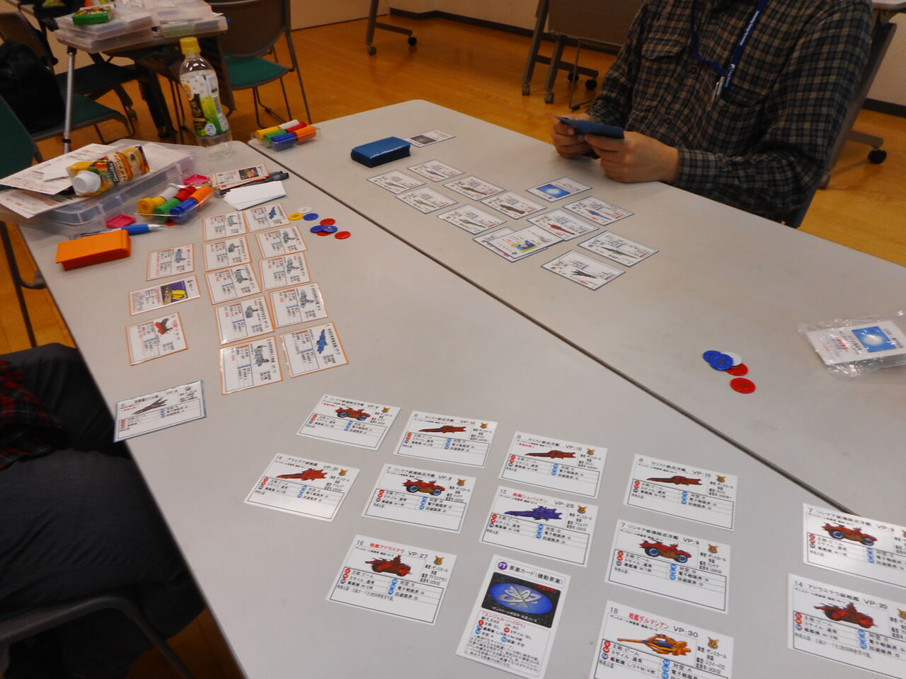この日、15周年記念のため、グループ乾坤一擲の平さんが用意してくれたのが、「Ships & Tacticsワンディトーナメント」でした。予選を1対1の対戦として、勝者グループと敗者グループで本選を行う、変則トーナメントです。全ての参加者にS&Tの1デッキを、本戦の両グループの勝利者にスターターセットと4組(第2組は、2組のデッキ)を賞品として用意いただきまして。来場した順に好きなデッキを選び、組み合わせを決めて、予選へ。