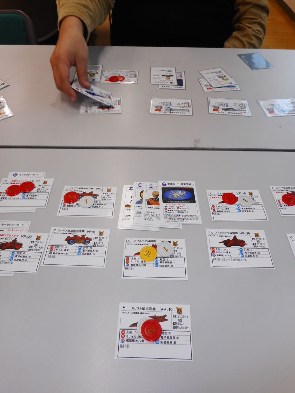 予選を勝ち抜いた3陣営による頂上決戦。地球防衛軍が波動砲をぶっ放して星界軍を撃破し、星界軍は高い攻撃力を生かして、両陣営を同等に削ります。と、「危険がアブナイ」宇宙戦艦ヤマトが前衛に出てきたので、ここに攻撃が集中。星界軍が半分のヒットを与えたところで、ザン・スカール帝国(mitsu)が、モビルスーツの飽和攻撃で漁夫の利を得ます(40VP!)中盤にエンジェル・ハイロゥが稼働したので、本命の地球防衛軍(にし)のカードを削りまくり。ここで一瞬の隙を突き、アンドロメダも撃破!止めは、カイラスギリーの斉射で星界軍からもVPを得て、ザン・スカール帝国(mitsu)が勝利しました。