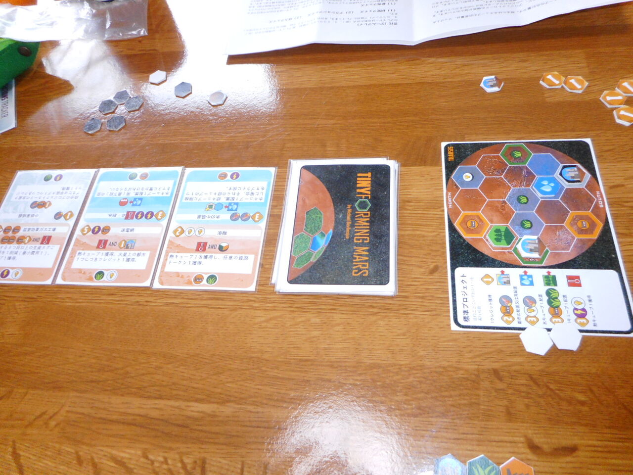 この日、SF級好きのBIBIさんが持ち込んだのが「Tiny Forming Mars」(同人)です。いわゆる「テラフォーミング・マーズ」のオマージュで、同作品のエッセンスを凝縮した1-2人専用のミニゲームです。原版が相当量の要素を詰め込んでいるので、形はミニ版ですが、中身は濃いです。