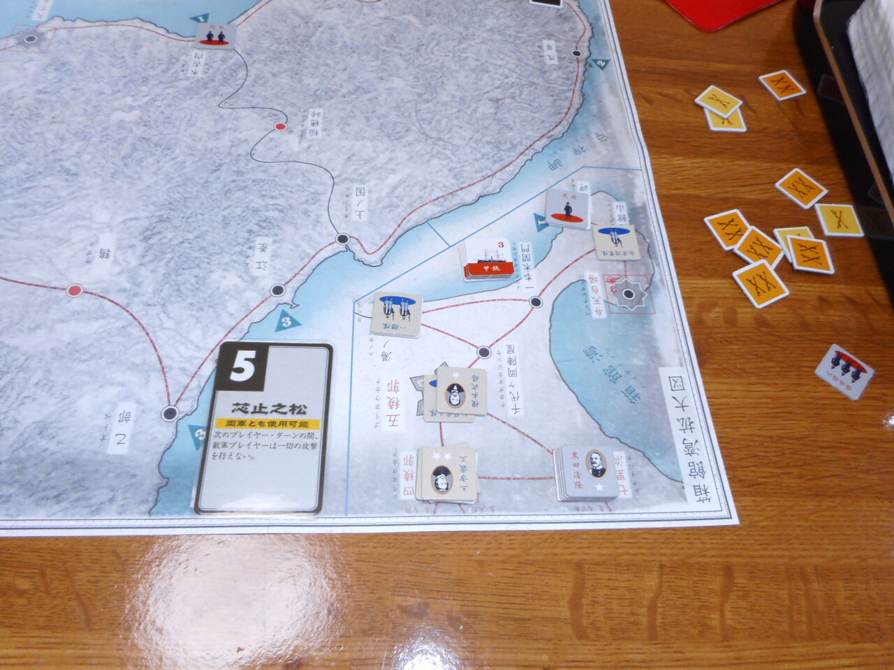 両軍とも、手番はあと1回ずつ。四稜郭にいる土方隊を撃破できれば新政府軍の勝利、そうでなければ共和国軍の勝利です。と、ここで引かれたカードは、寄りによって「芯止之松」!両軍が停戦したことにより、共和国軍の勝利となりました。