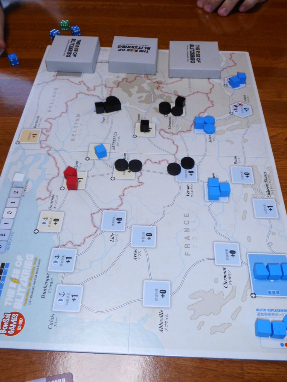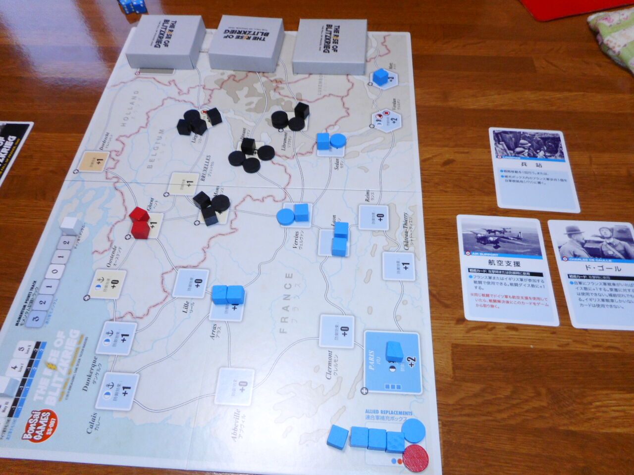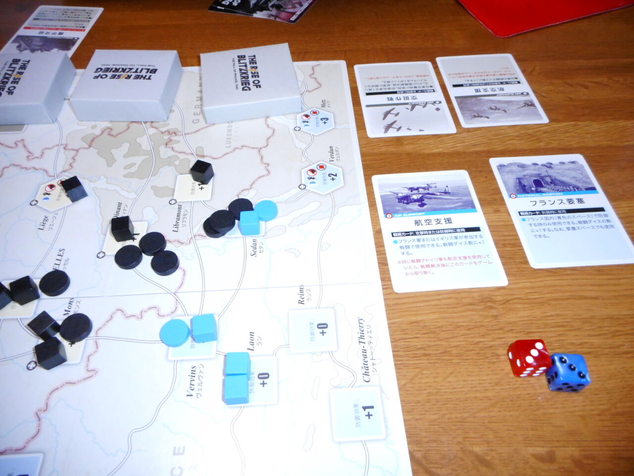 第5ターン、ドイツ軍はザールブリュッケンからマジノ線を攻撃!やはり、そうか!あえて装甲師団を投入して勝利したものの、その先が続かず。連合軍は予備を投入しようとしましたが、ドイツ軍はカードの組み合わせを間違えたらしく「ああ、ダメだ・・・」と投了となりました。