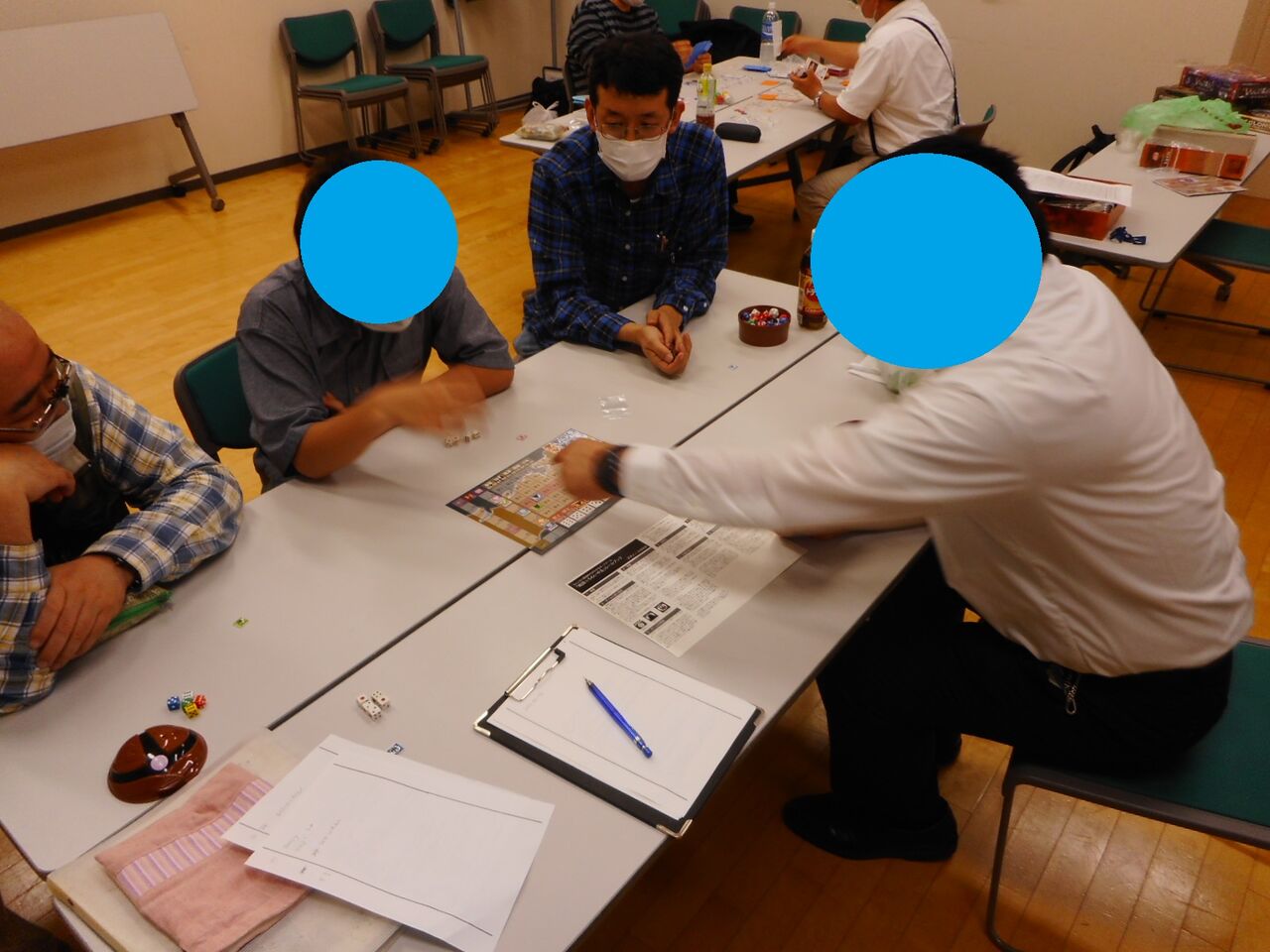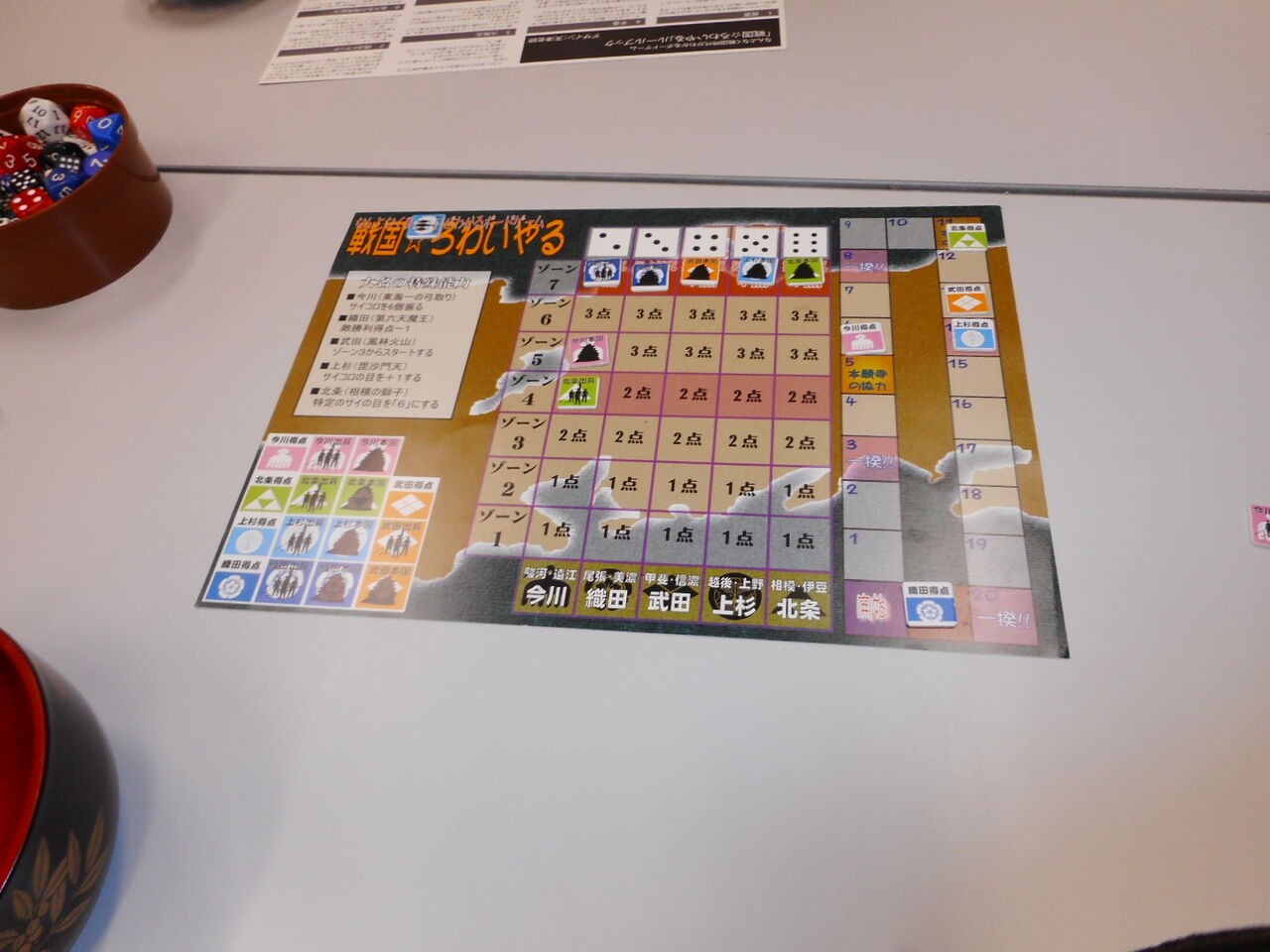 第一戦の陣営は、今川(kawa.Jr)・織田(mitsu)・武田(エンジョウ)・上杉(BIBI)・北条(kawa)。序盤にいきなり武田(エンジョウ)の武力が爆発し、北条(kawa)を攻略してしまいます(6を連発で8VP! )。織田(mitsu)が「他家のVPを-1できる」能力で足を引っ張りますが、先制の利は高く、他家もそのまま、追いかけるのがやっと。一揆を受けながらも大敗北することもなく、武田家の勝利に。
