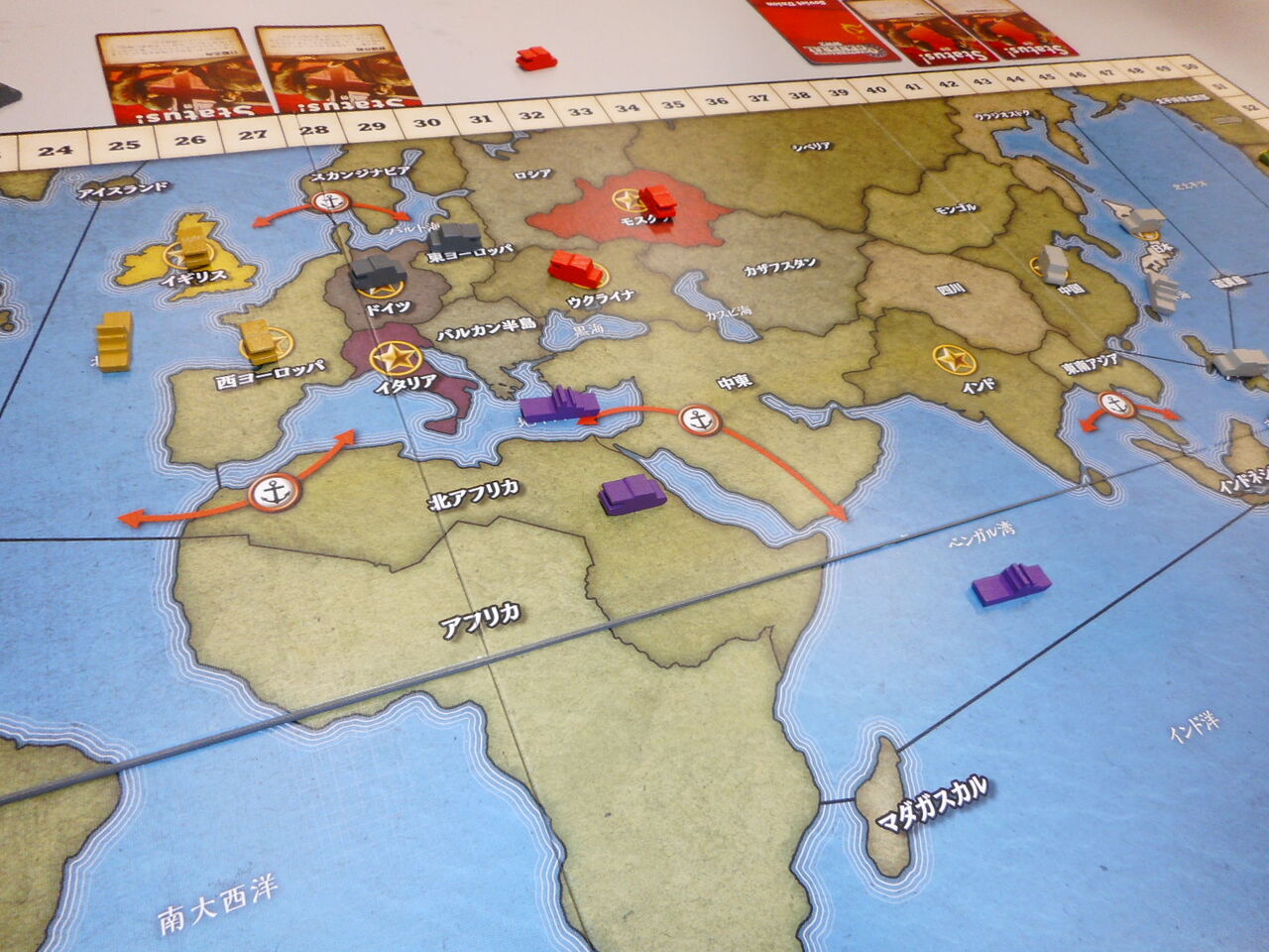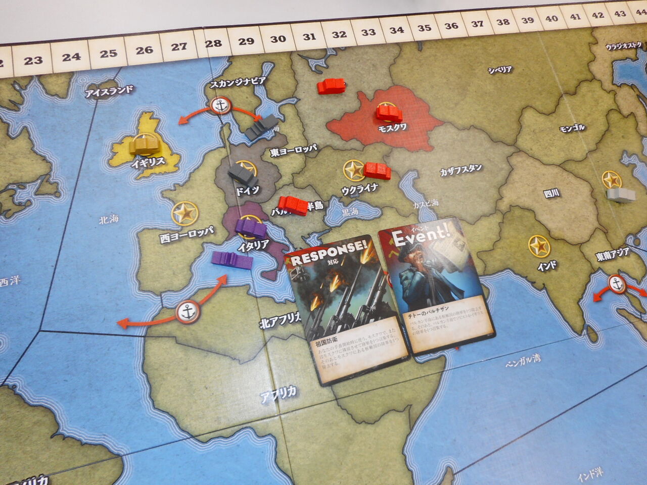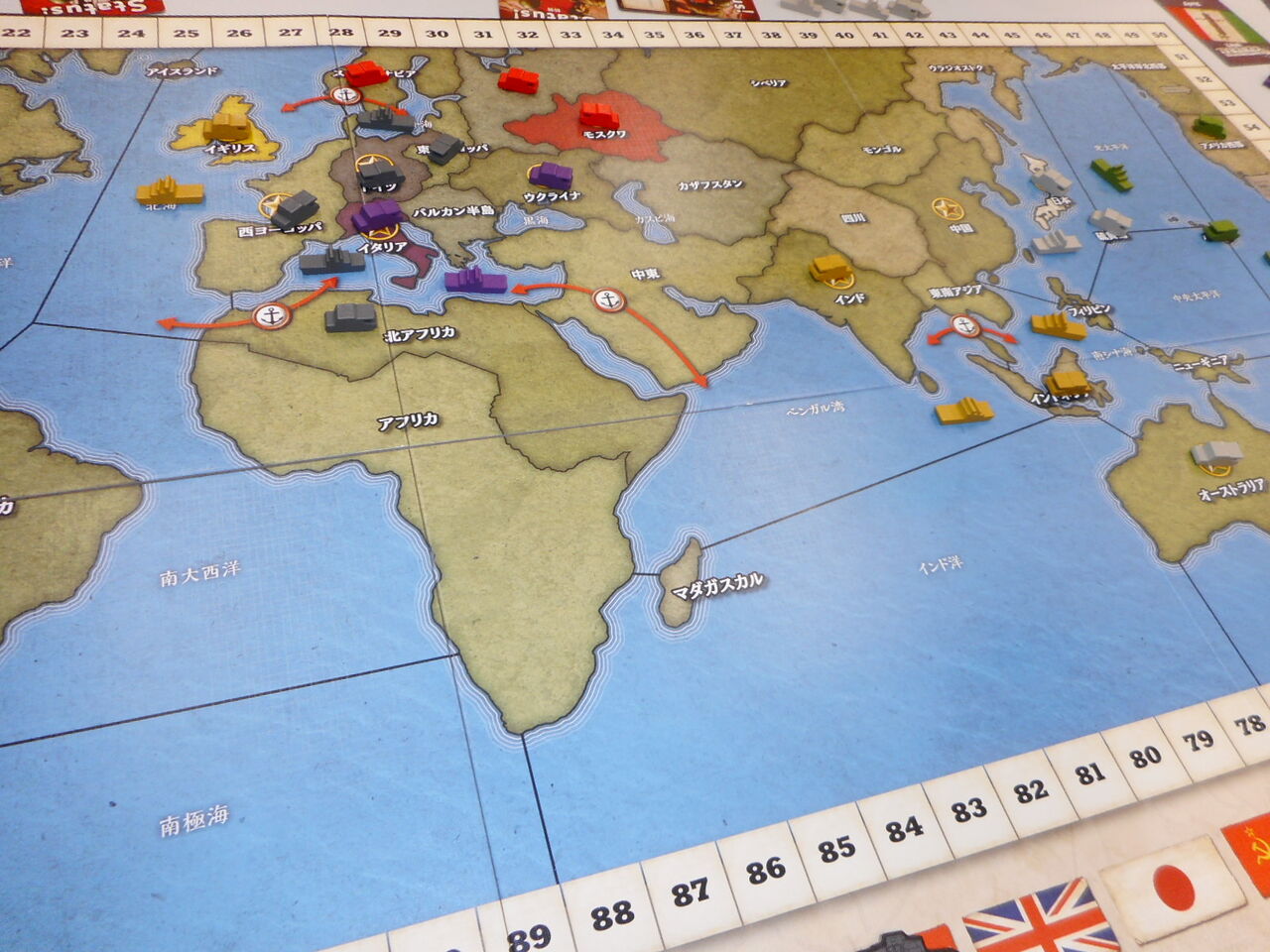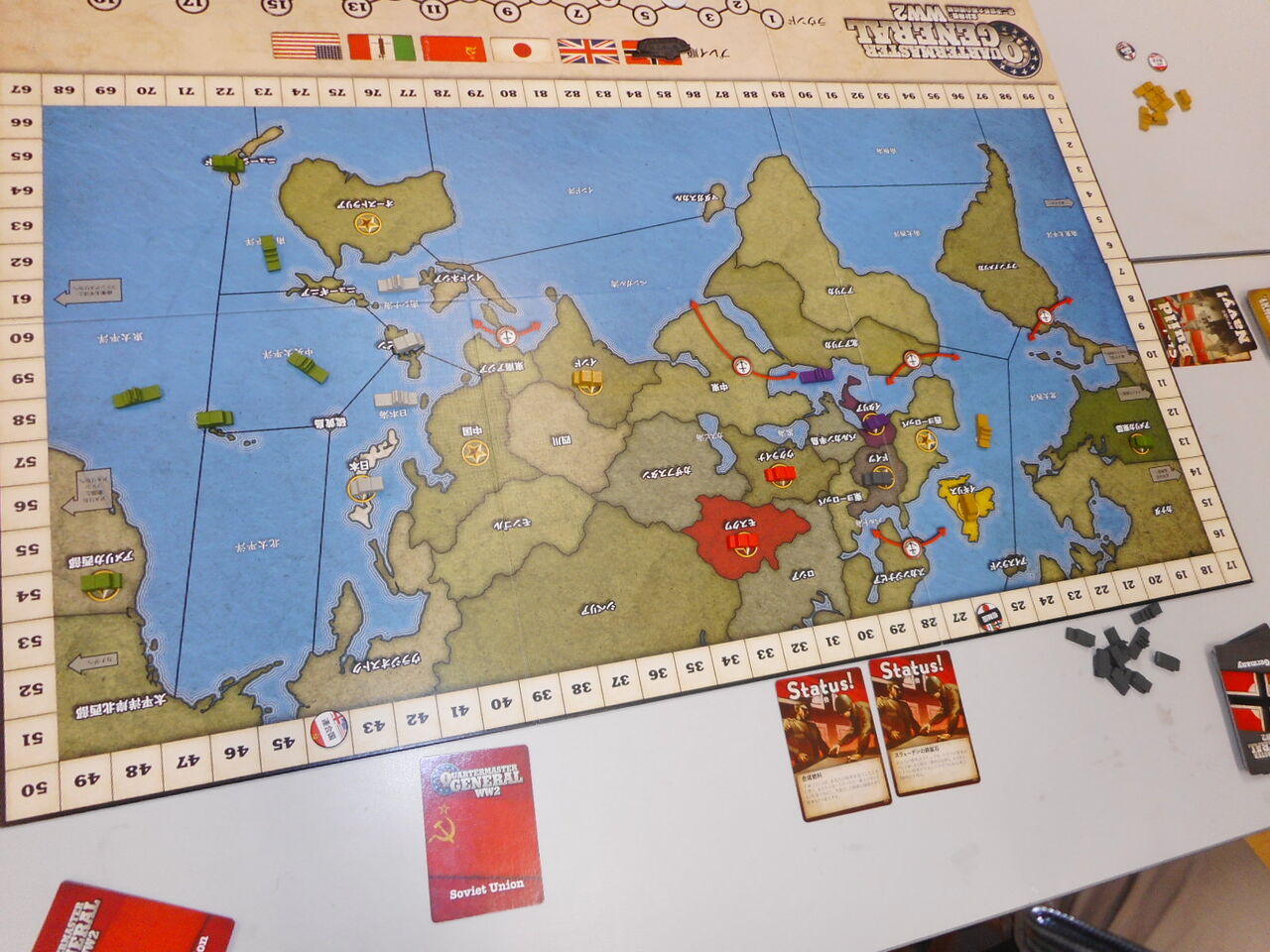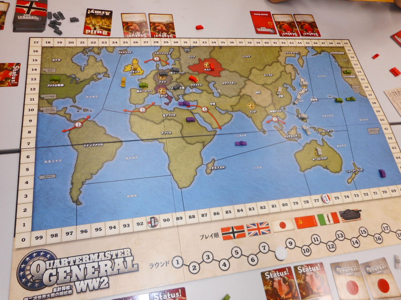 連合軍がVP地点を抑えて、序盤からリードしますが、枢軸軍は肝心な健軍カードが来ず、占領地が広がらず。あるいは、海洋伝いにオーストラリアを取ったのはいいのですが、中国進出が遅れ、VPがジリ貧に。