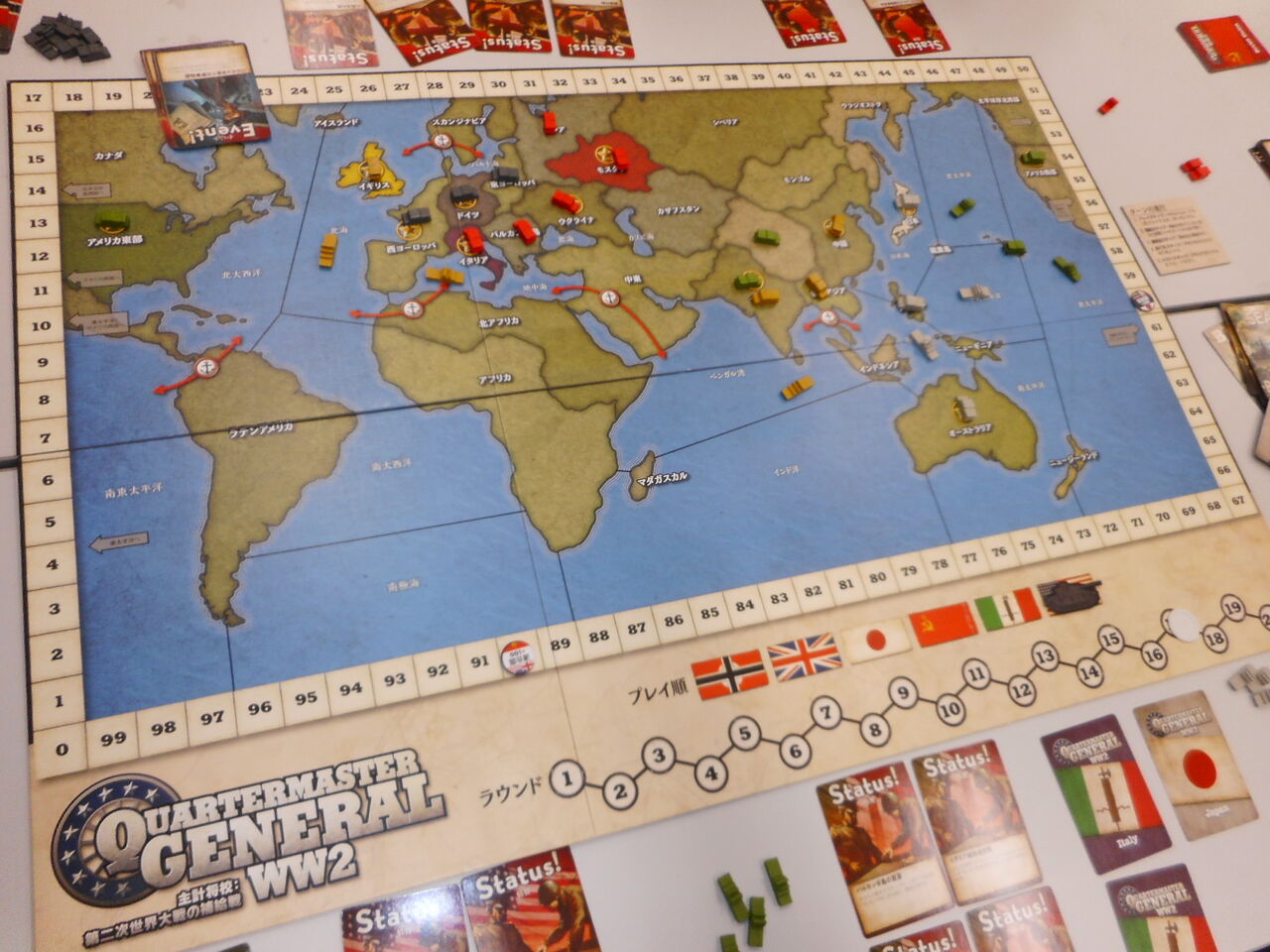 GUNDAMでこだわりを見せた後、同じ4名で「Quarter Master General」(HJ)を対戦しました。最大6名までプレイできるアイテムで、以前、オフ会で2人でプレイしたのですが、さすがにきつかった思い出が。とはいえ、人数がいれば、思考負担が少なく、やりやすいゲームかと。