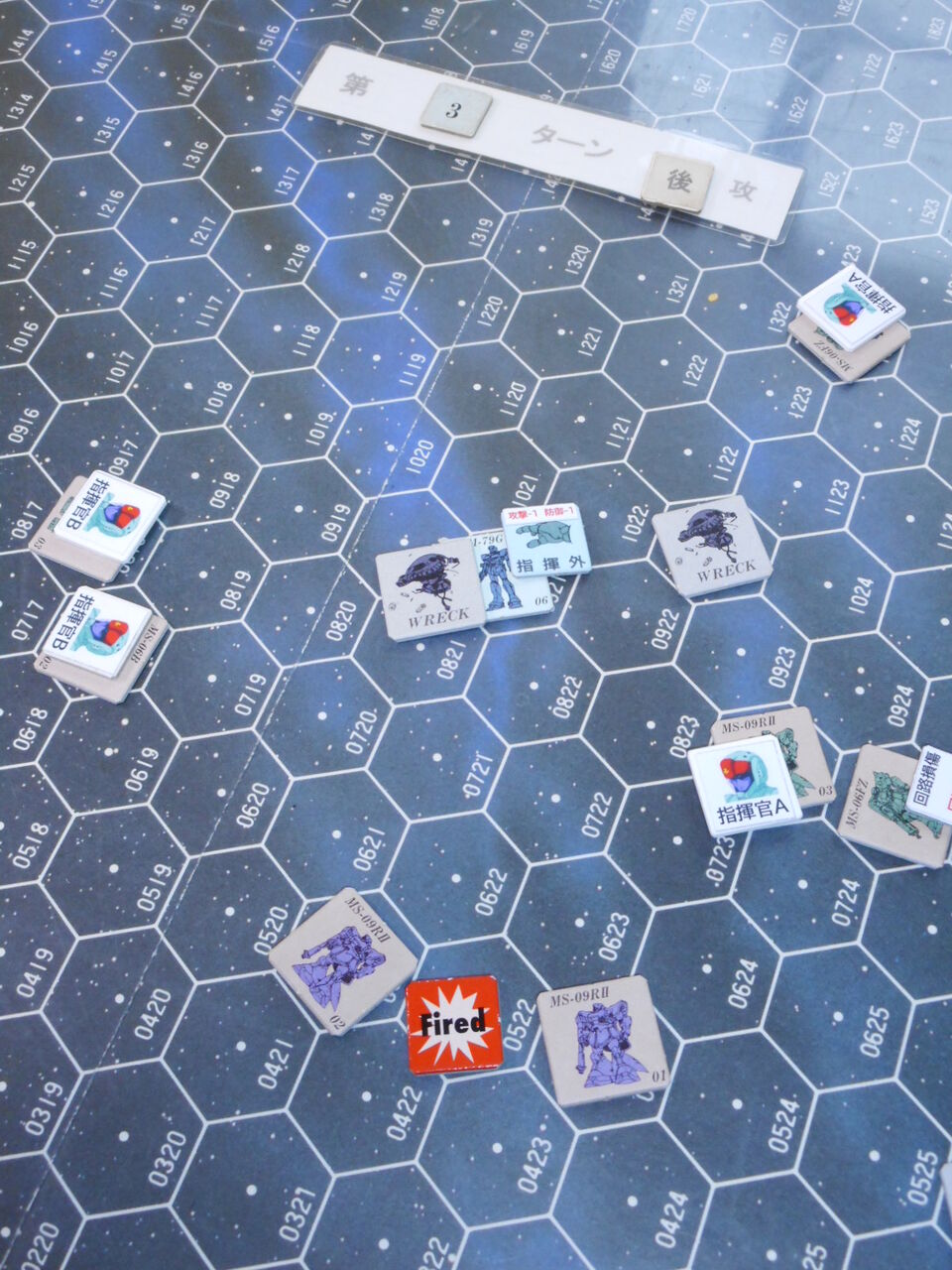 牽制作戦も虚しく、半数近くのモビルスーツを撃破されたサイド6守備隊は、次ターンの乾坤一擲の反撃を狙って、バーニアを吹かしてザクⅡ隊の中へ飛び込みます。