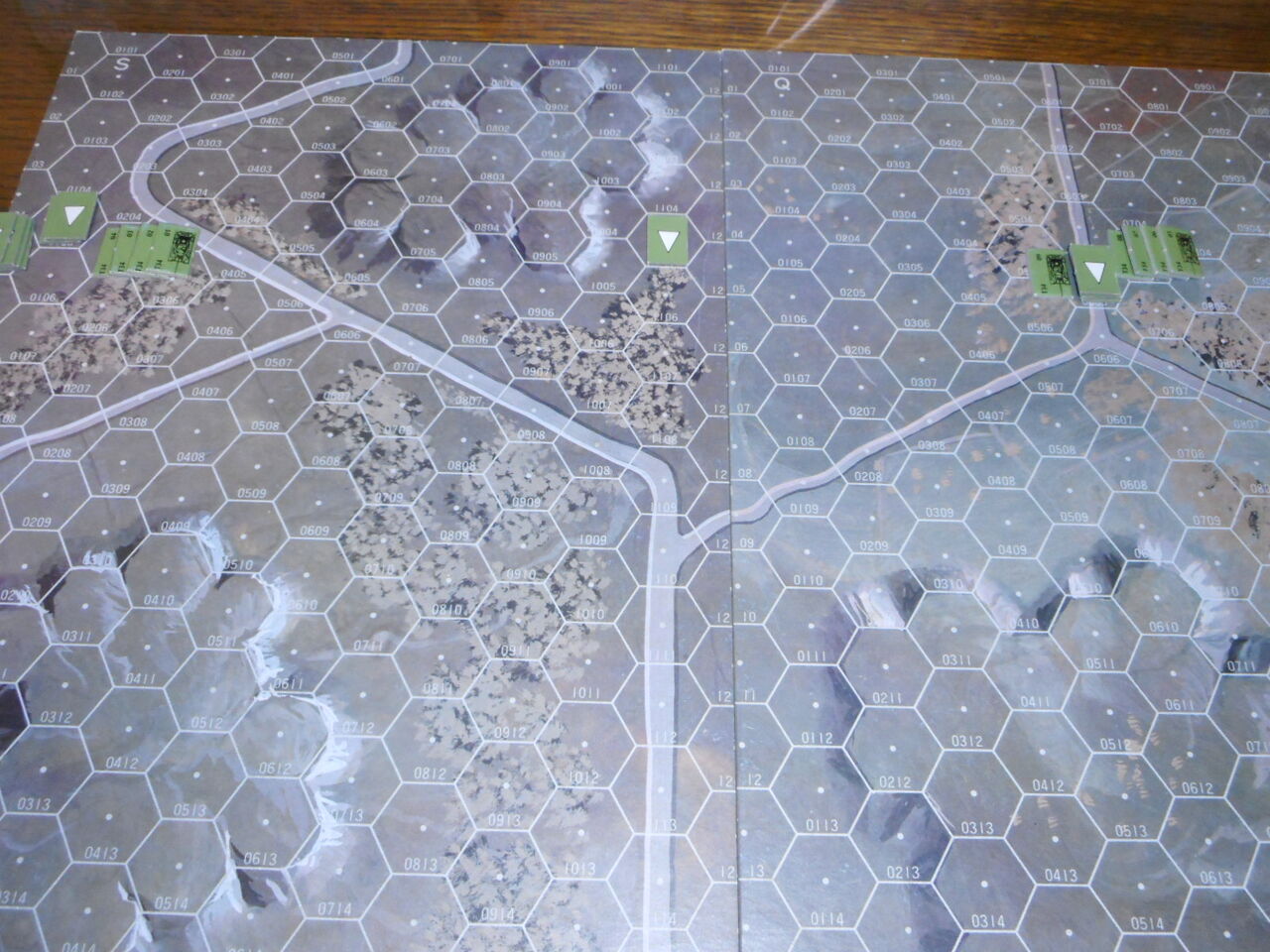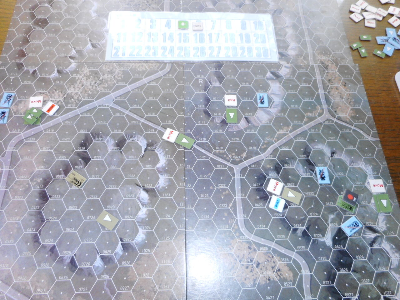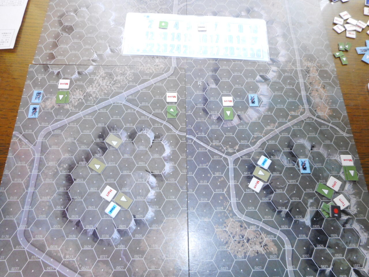 第1ターン、事前計画通り、朝鮮人民軍が動き出します。今のところ、左右どちらが主力かあるいはダミーかは不明のため、国連軍は偵察のために左翼の1輛を、西盤端に向かわせます。両軍ともじりじりと前進を続け、第1ターンが終了します。