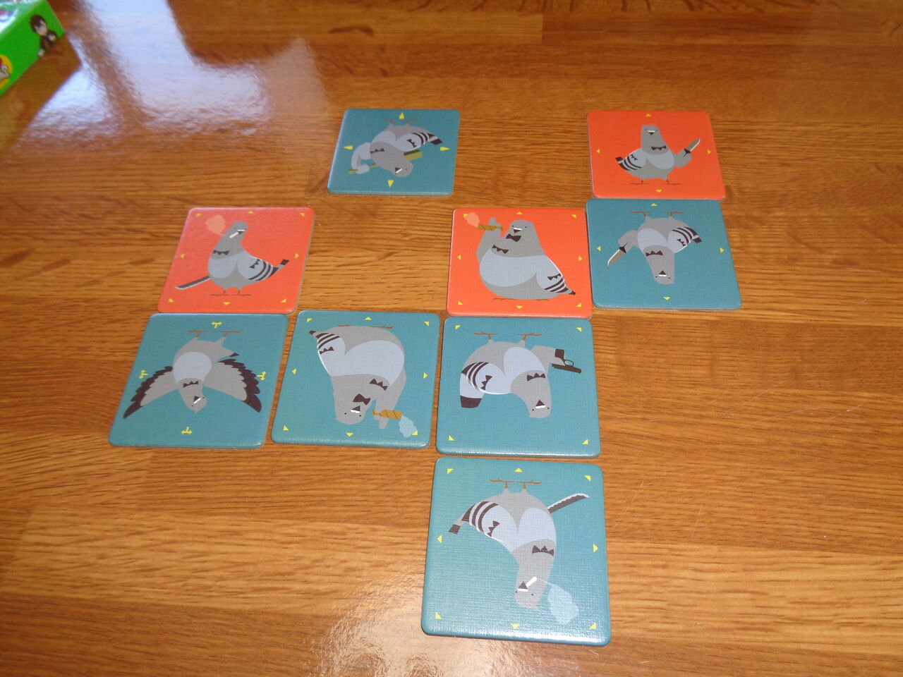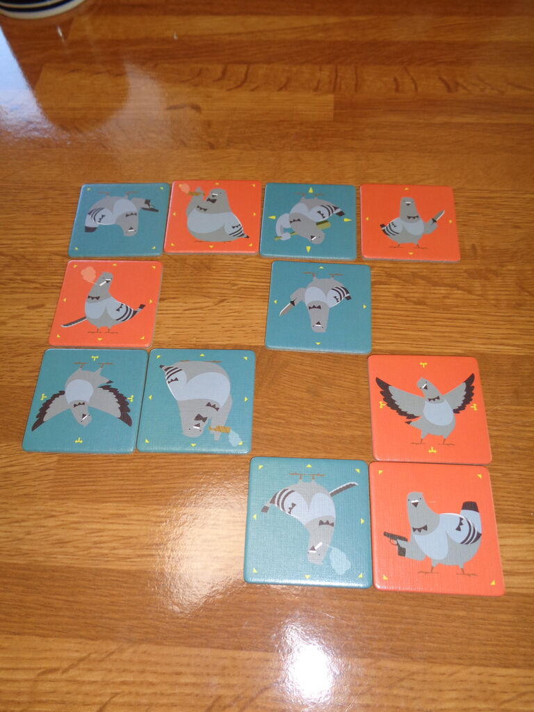 初戦はダイソーブランドの100均ゲームから「トウキョウのハト エサバ・バトル」(ダイソー)です。青と赤の鳩組(?)の餌取り合戦を描いたアブストラクト・ゲームで、ボスの周辺を封鎖して移動不能にすれば(餌がとれなくなり)勝利です。