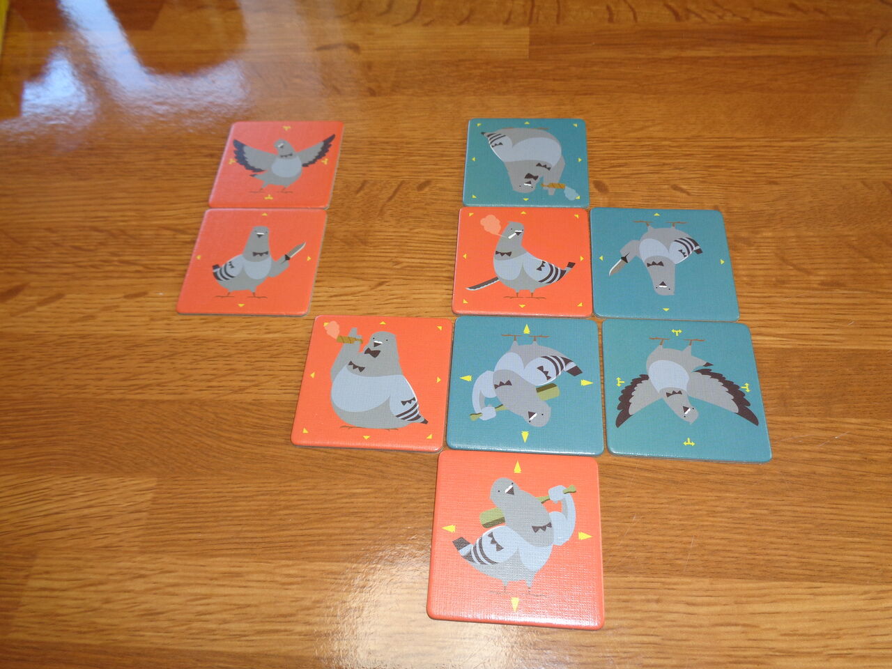 ボスの隣には配置できない、味方から完全に離れる移動はできない、そして、なにより、「マップ(餌場)」は4×4に限られることがポイントです。16マスの「マップ」といっても、専用マップがあるわけでなく、ユニットの配置やとり除きによってに、場が変化していきます。そう、実際に鳩に餌をやると、集まった鳩が蒔いた場所から移動していく様を表しています。