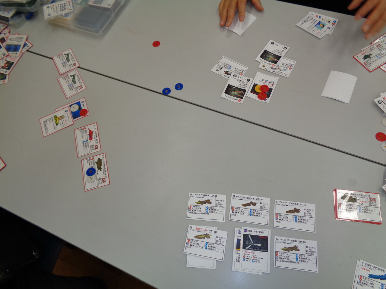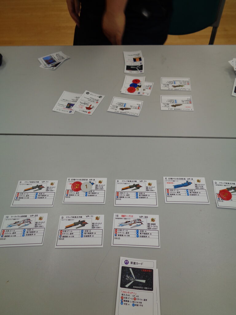 ゲームは、設定どおり、地力に勝る地球連邦軍F91が優勢に進め、クロスボーン・バンガードの艦艇を削っていきます。CVはバグを投入するも、そもそも艦隊キャラが少ない地球連邦軍にはほぼ影響がなく。 後半にベラ・ロナのビギナ・ギナで、F91と相打ちに持ち込みますが、鉄仮面の引きが遅かったため、ラフレシアも数回、活躍しただけでした。結果は、地球連邦軍F91の圧勝でした。