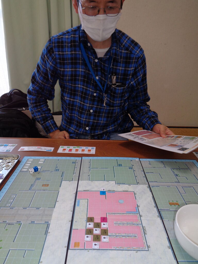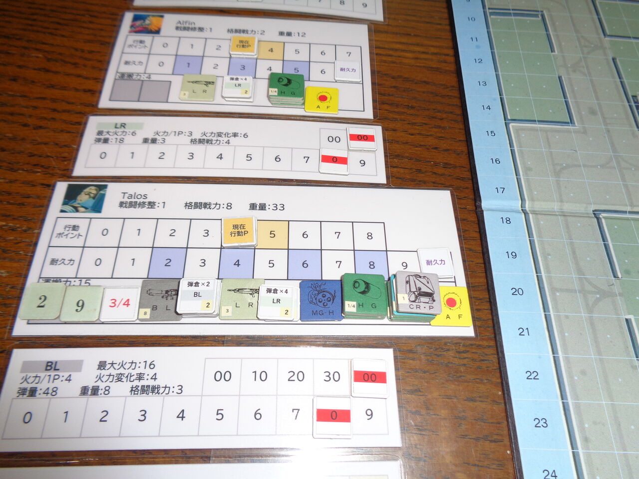 ともあれ、約1週間をかけて(!)コンポーネントを一新し、いざ、対戦へ。24名のキャラと武器シートは場所はとるものの、相当、プレイしやすくなりました。オリジナルの「プロットの帳簿管理」だと、ぶち切れていたかも(笑い)。