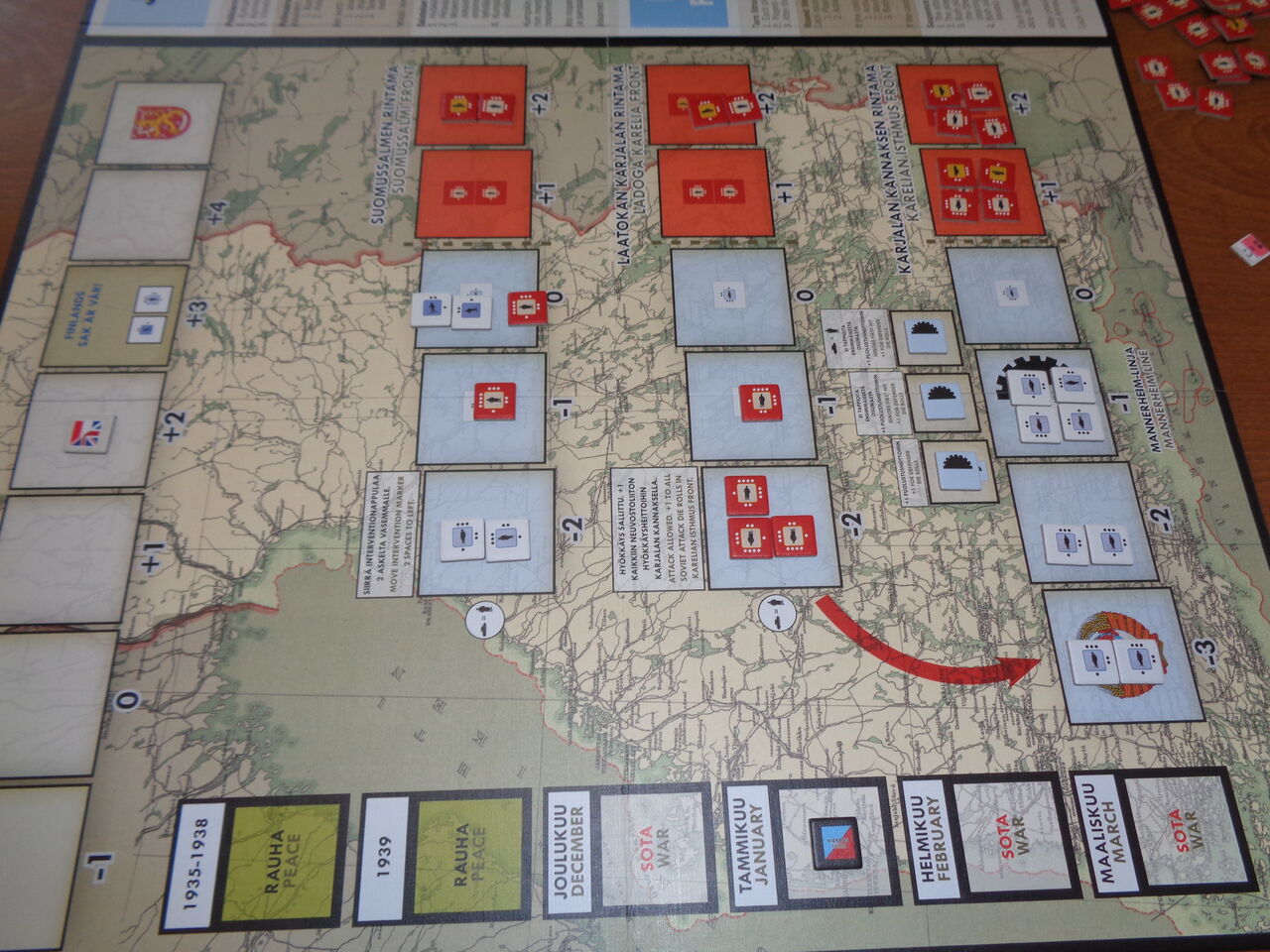 最終第6ターン、ソ連軍は最後の希望のカレリア地峡で、猛攻に出ます。強力なカードを使った攻撃drがまたも冴え、二度ほど、マンネルハイム線が突破されかけます。が、フィンランド軍は後方から増援をつぎ込んで、ギリギリで持ちこたえます。