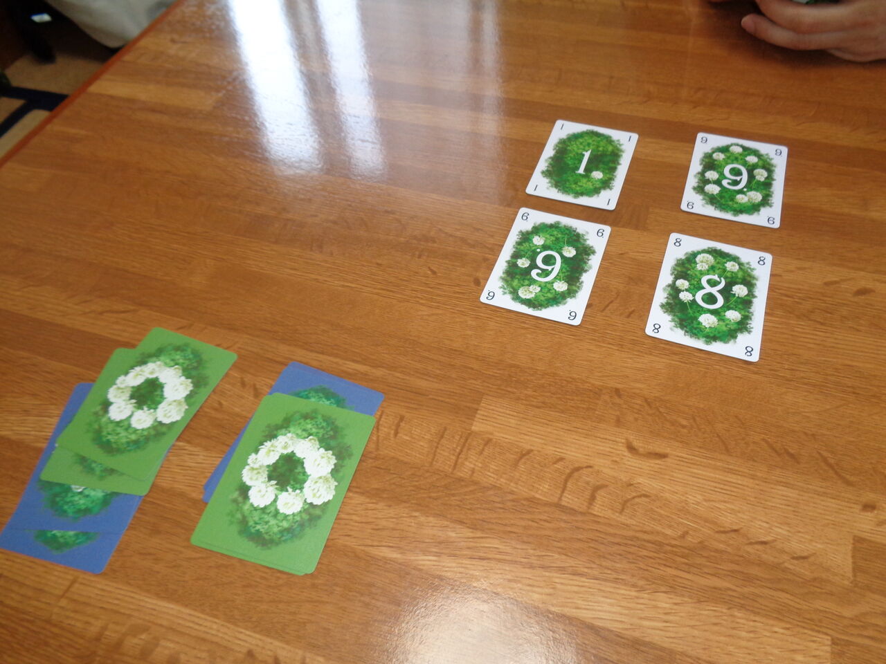 まずは、運と読み合いのカードゲーム「クローバーブーケ」です。プレイヤーは「乙女」となって、クローバーの数の多いブーケを作ります。手元には、0-9の数字カードが配られ、ランダムで同時に1枚ずつをめくり、その後、もう1枚を手元から選んで投入します。2枚のカードの数値が大きい側が勝ちで、そのブーケを受け取ります。ランダム5枚、選択5枚の5番勝負で、あいこ以外のブーケ数の多い側が勝利です。ポイントになるのは、4(四つ葉のクローバー)のカードで、このカードが出たときは数が少ない側が勝ちです。