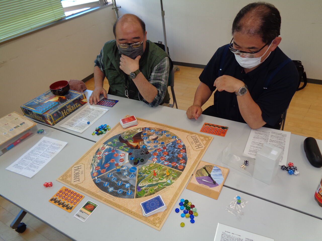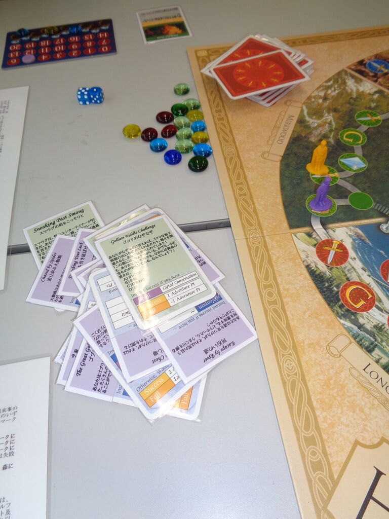 この日、自分が持ち込んだのが、トールキン原作の「ホビットの冒険」をゲームにした「HOBBIT」(Sophisticated Games)です。6人までプレイできる双六で、途中の冒険(カード)をクリアしながら、邪悪なドラゴン-スマウグから宝物を盗み出せるか、を競います。