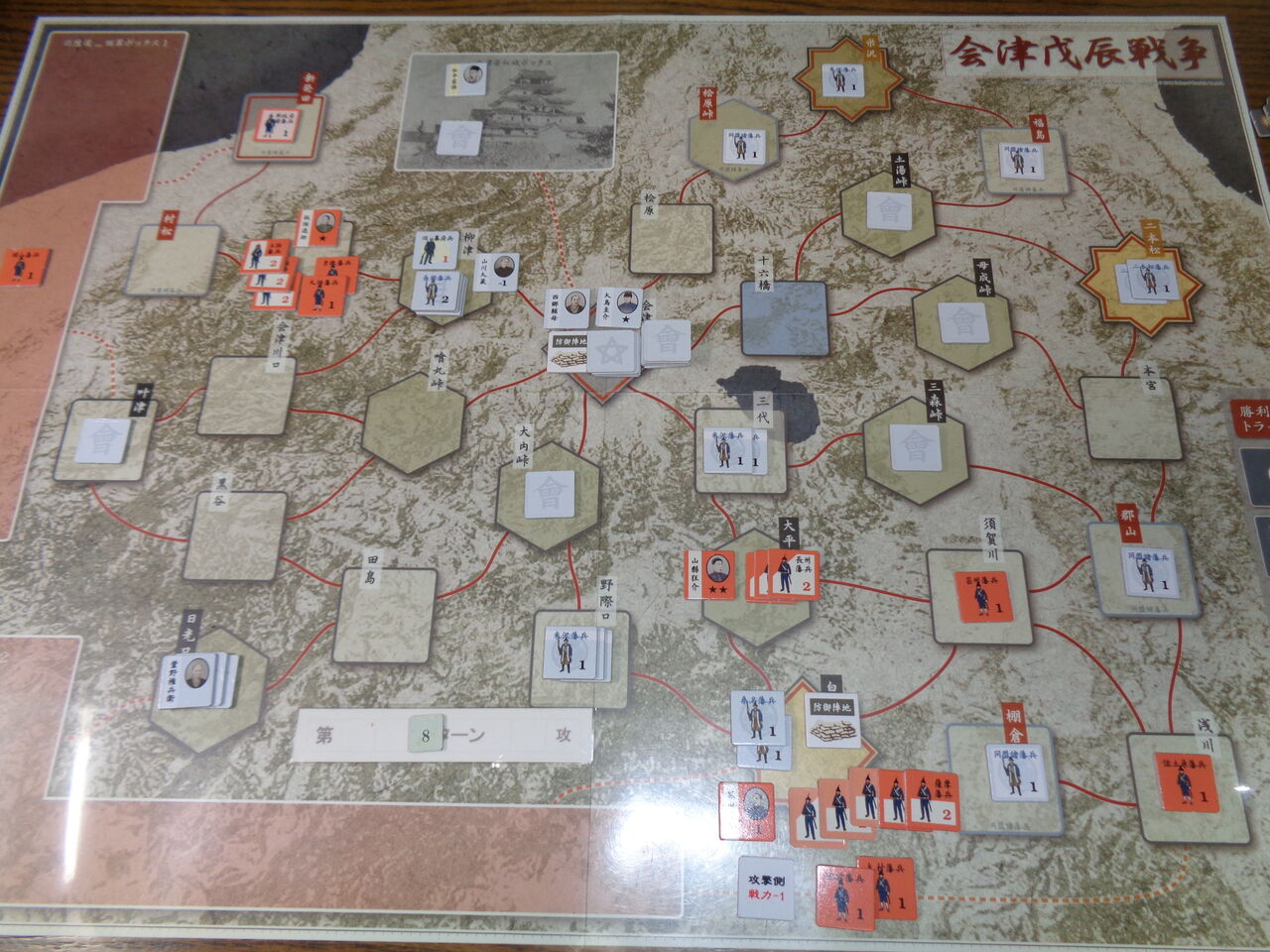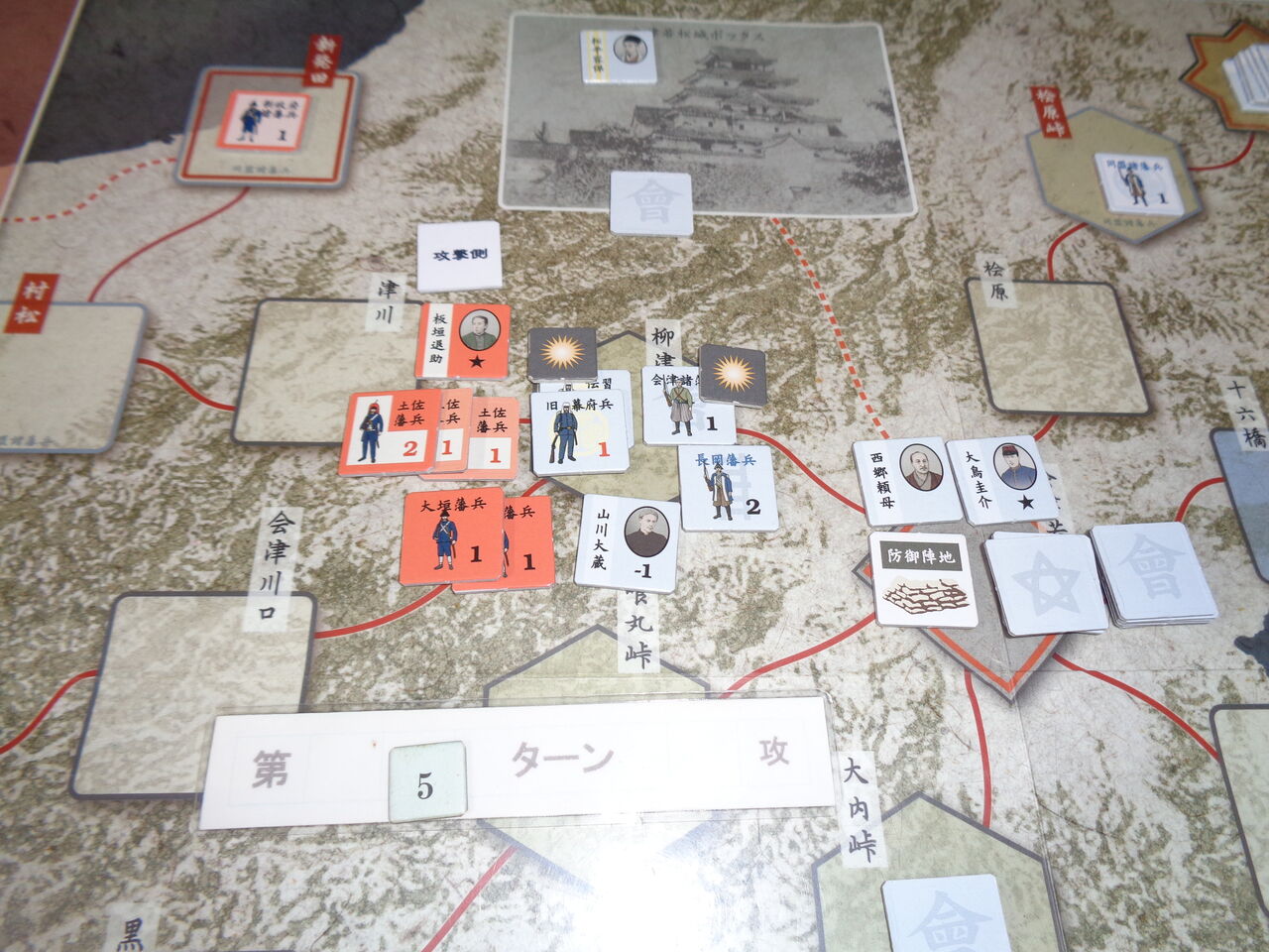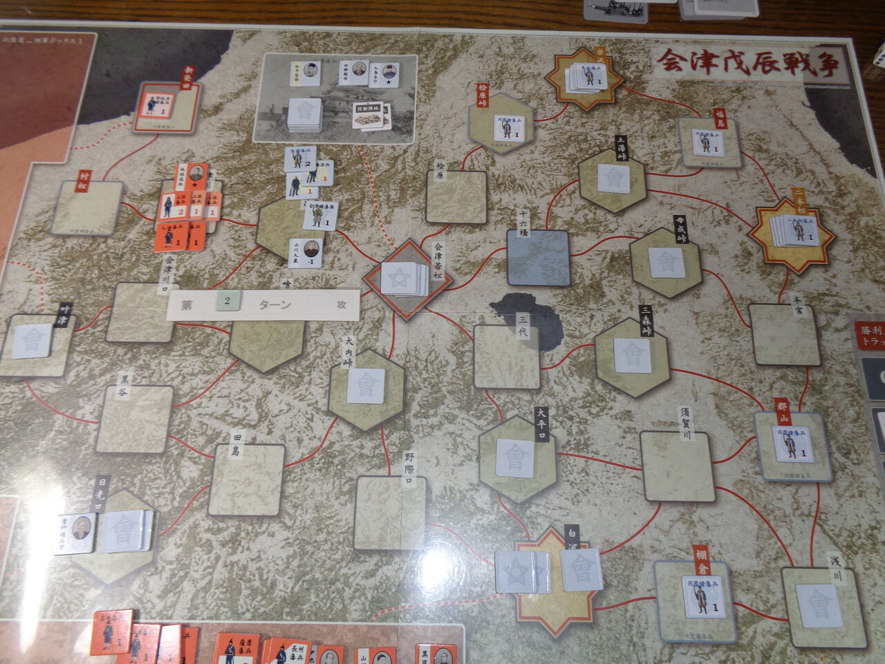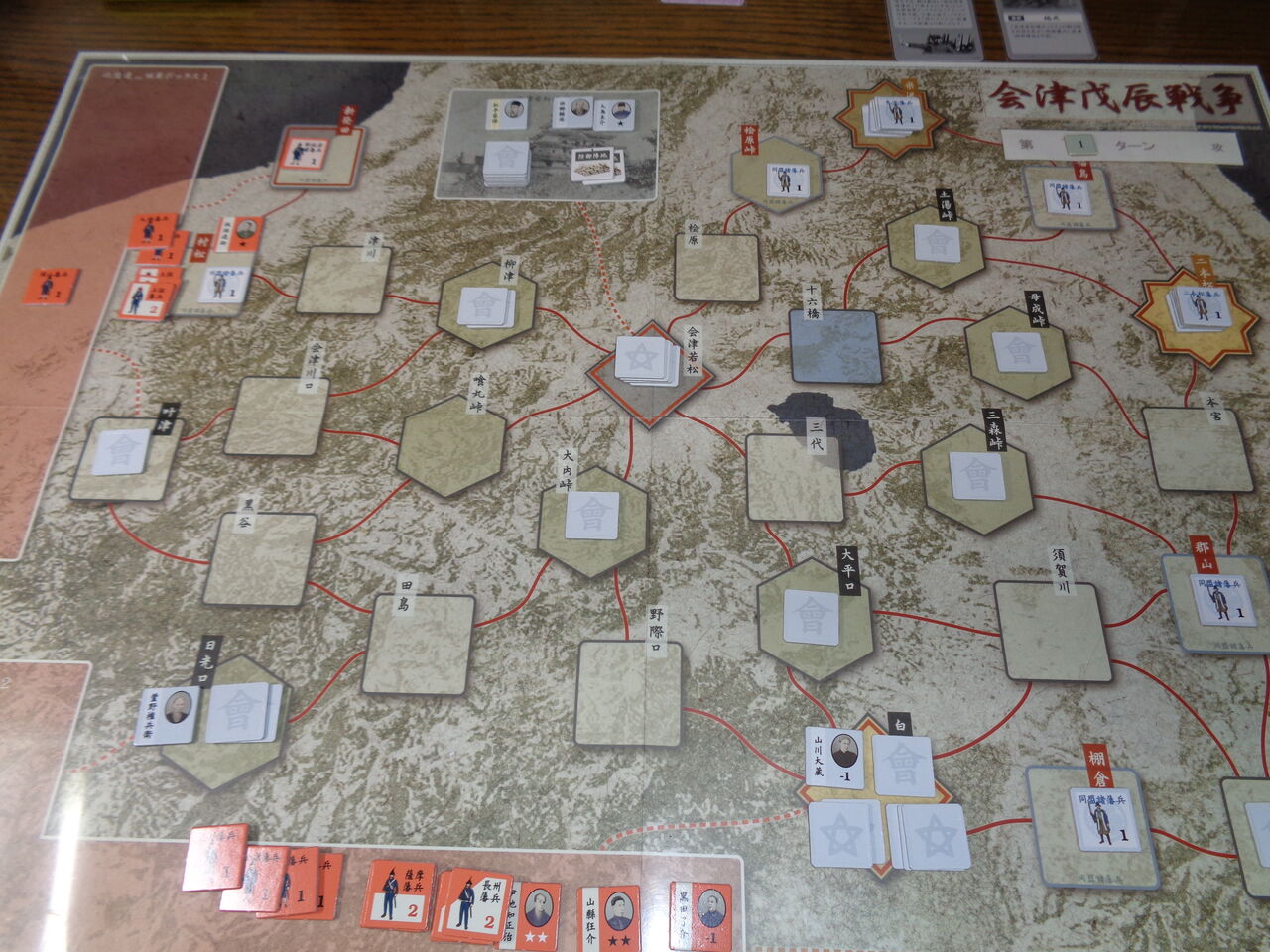 ただし、数戦のソロ演習では、史実同様に、隙を突いて会津盆地に突入した新政府軍が「錦の御旗」でこれを制圧し、そのまま、圧勝したこともあり。手札の廻りと投入のタイミングによるので、バランスはそこそこかと感じました。