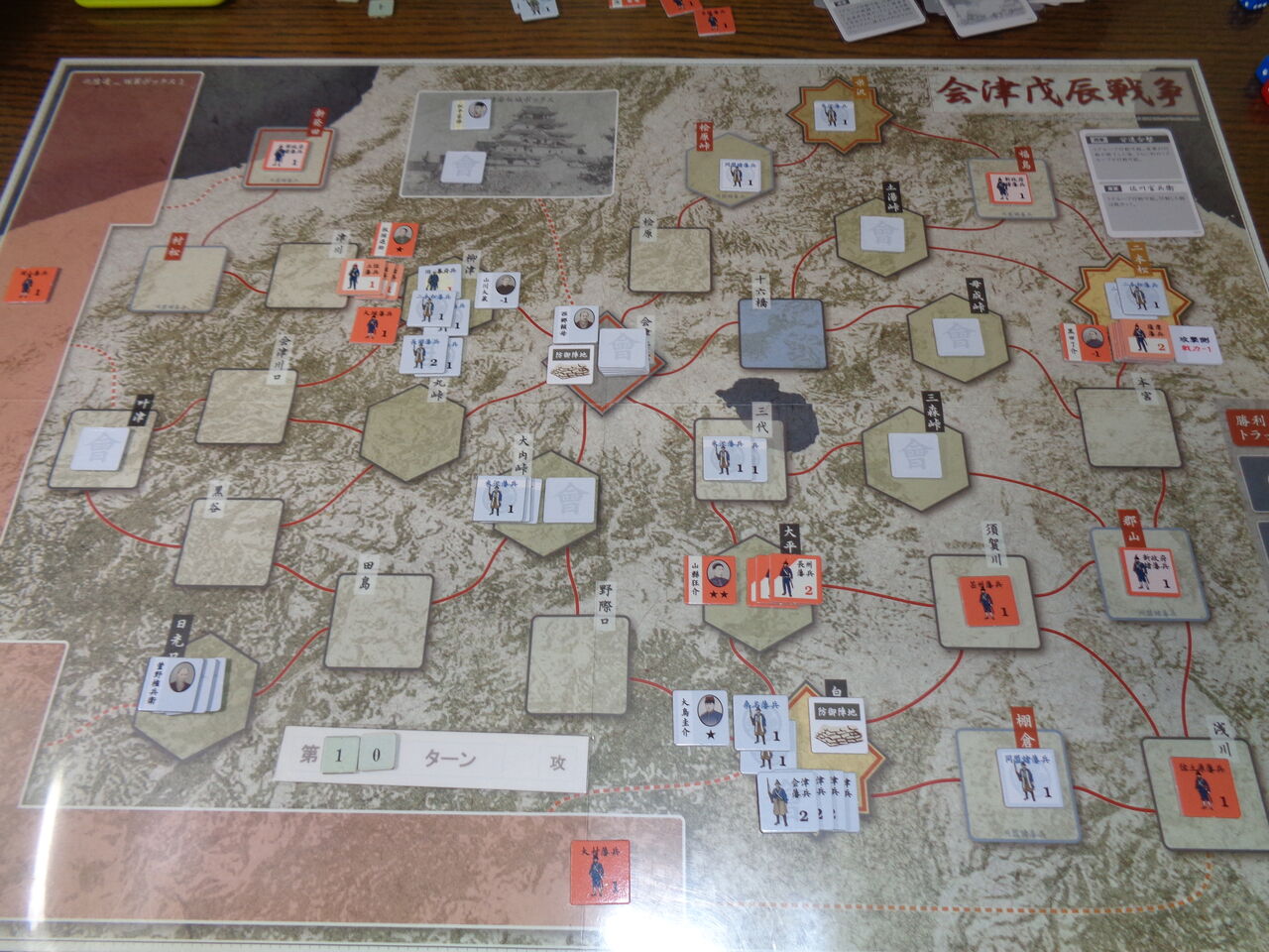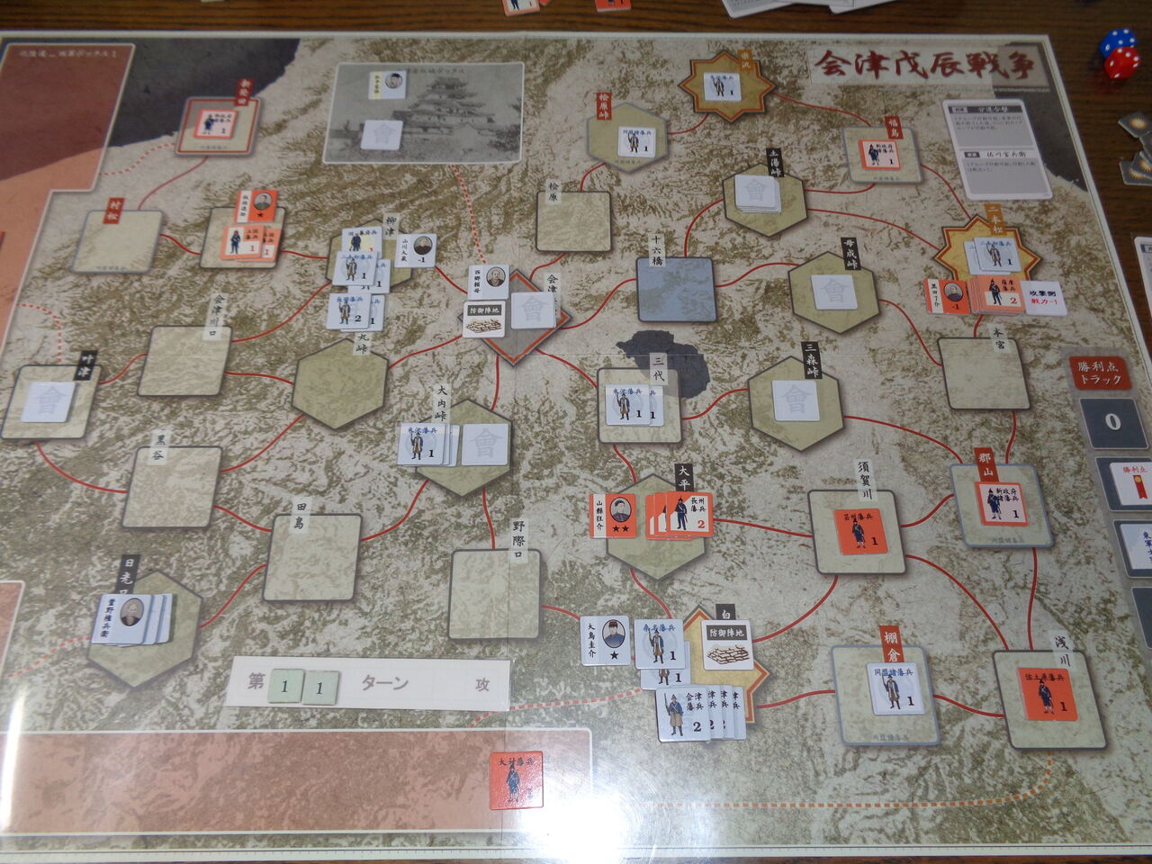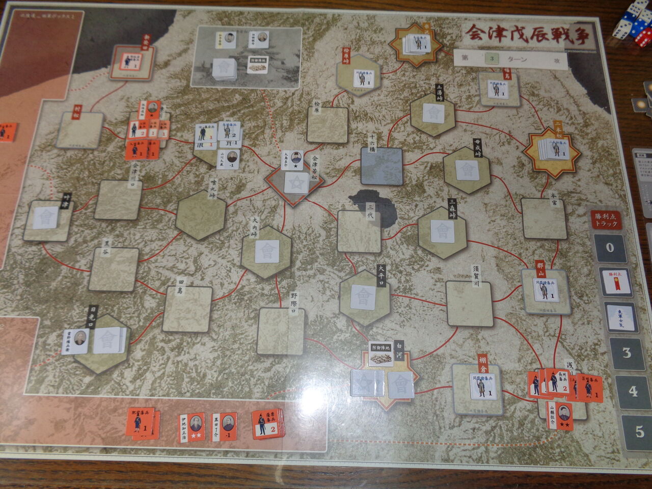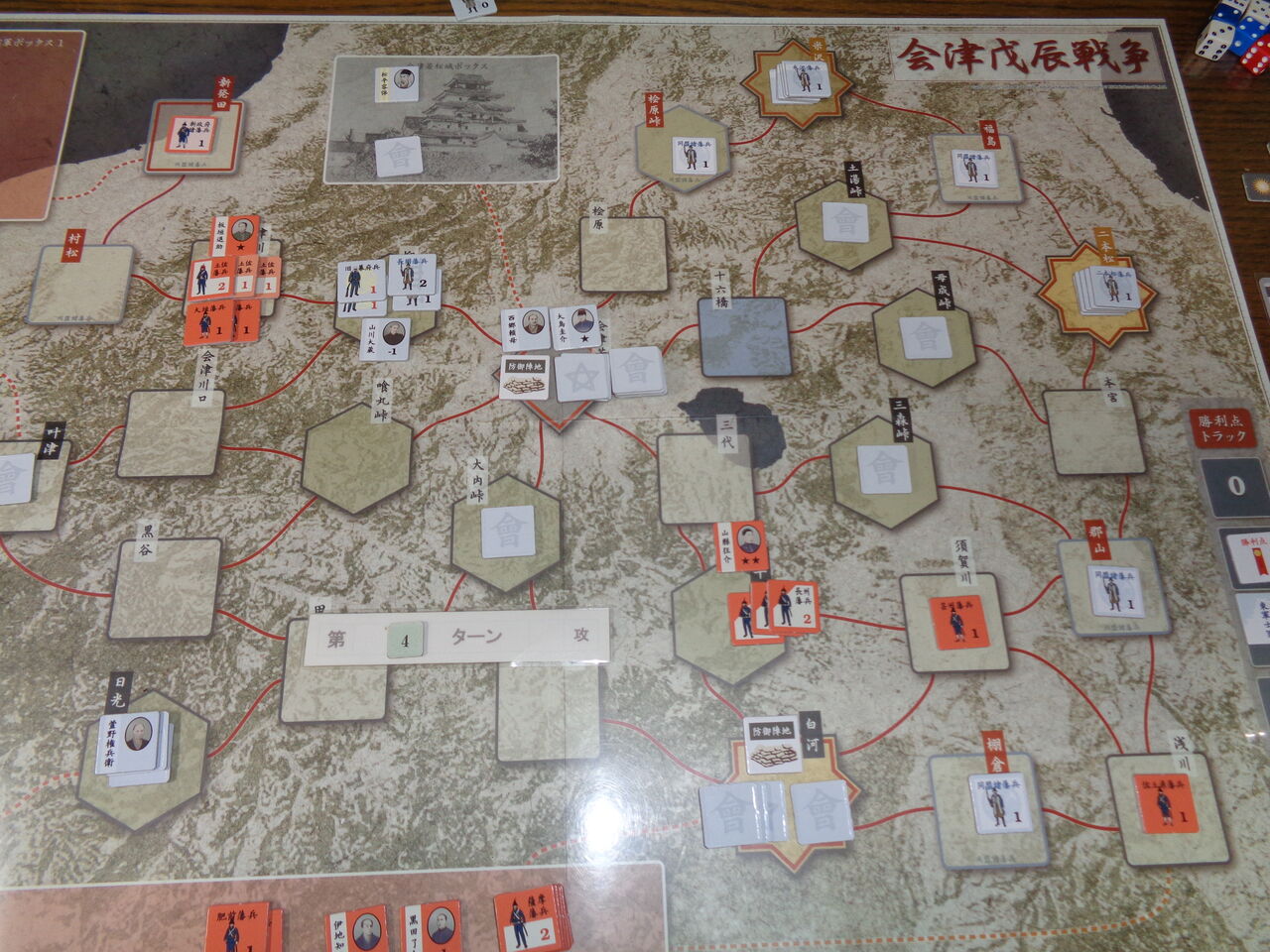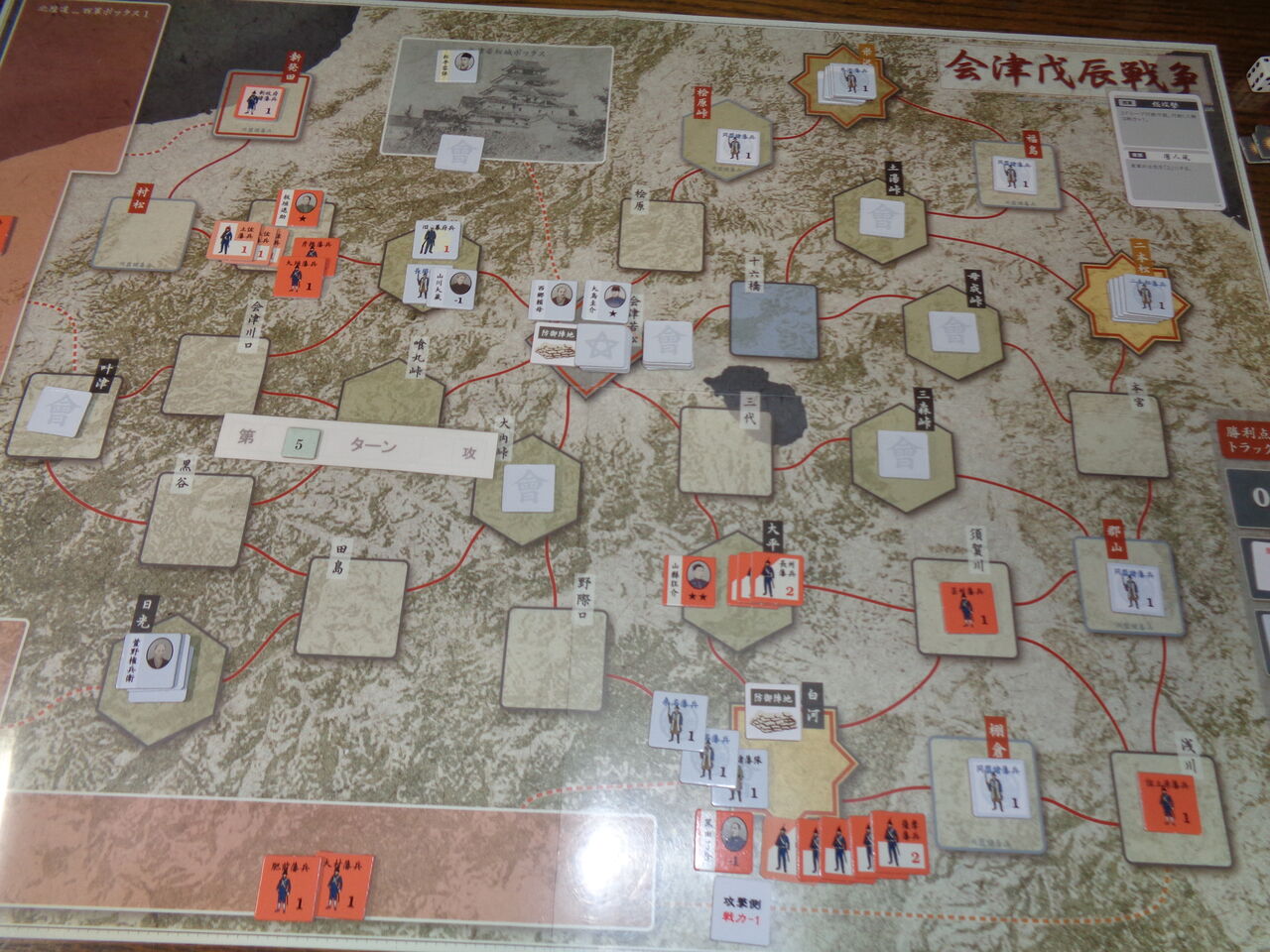 ただし、数戦のソロ演習では、史実同様に、隙を突いて会津盆地に突入した新政府軍が「錦の御旗」でこれを制圧し、そのまま、圧勝したこともあり。手札の廻りと投入のタイミングによるので、バランスはそこそこかと感じました。