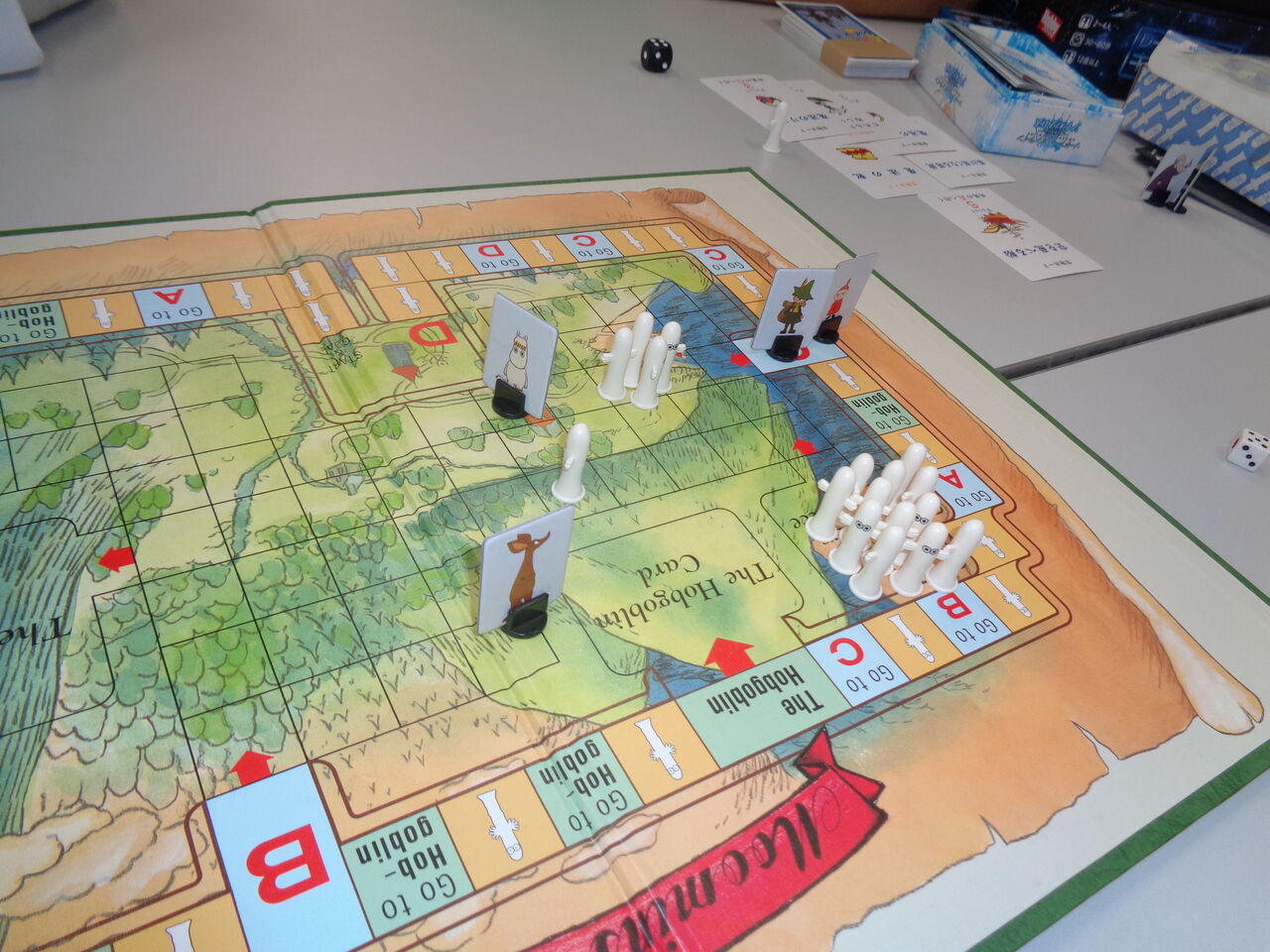 プレイヤーは外周のマス目に添って双六をするのですが、うち3カ所からムーミン谷に進入でき、ニョロニョロ島からランダムで湧き出すニョロニョロを捕まえ、宝物カードと交換します。一度に欲張ってニョロニョロを捕まえても、1d6して数以上を出さないと逃げ出され、VPにならず。全ての宝物カードがなくなると、家(ゴール)に向かい、着いた順に1d6した枚数のごちそうカードを受け取れます。