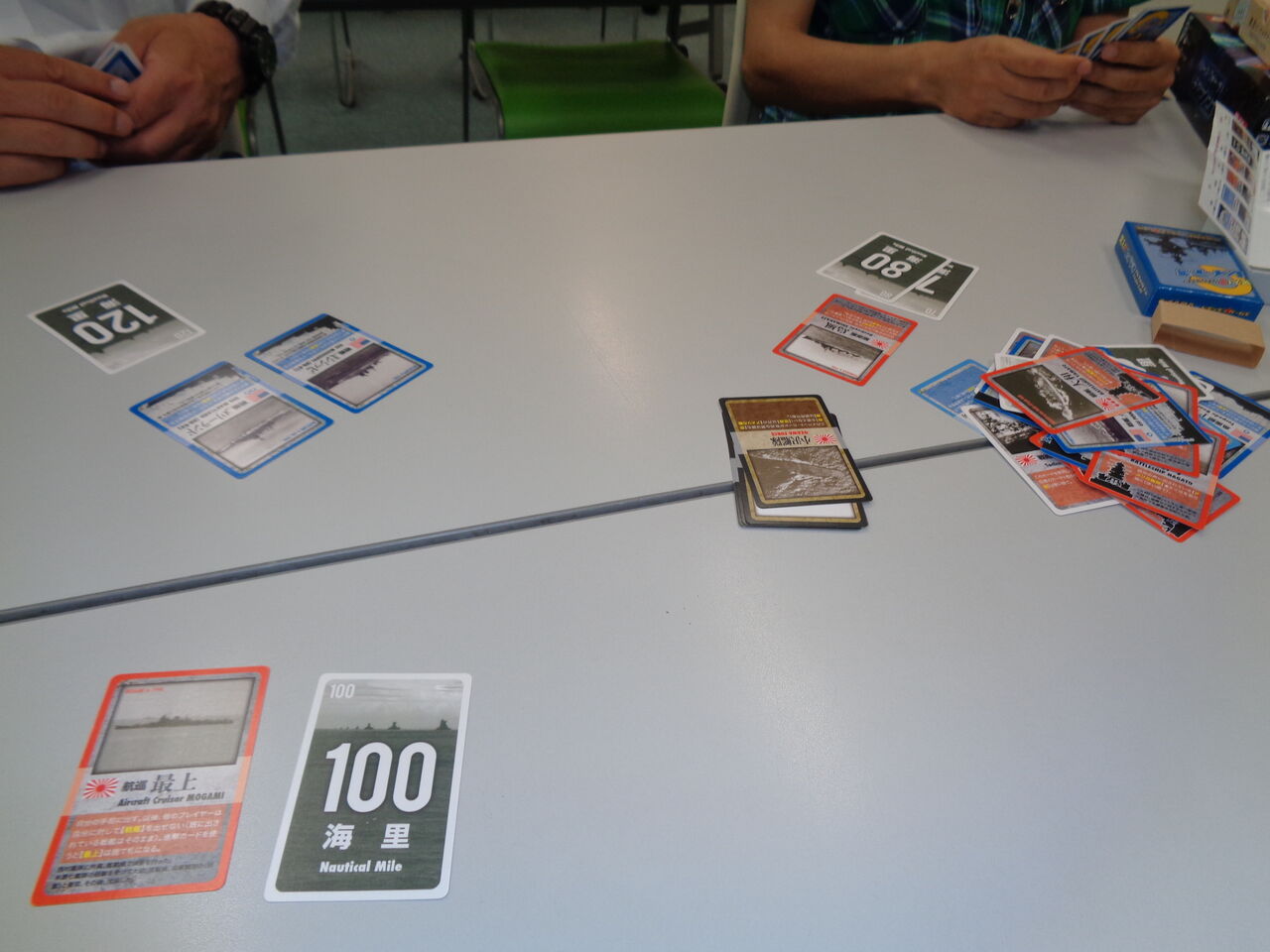 続いて、カードゲームの「突入?レイテ湾」(CMJ)をプレイしました。いわゆる見るボーンタイプの海戦ゲームですが、敵がアメリカ軍の戦艦だったり、空母だったりと、それっぽい設定がよく、カード運はあるもののバランスもいいです。なにより15分で、レイテ湾海戦ができるのがいい。
