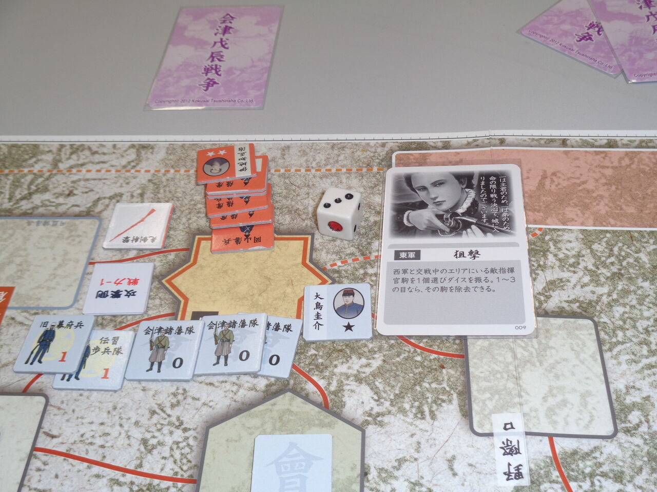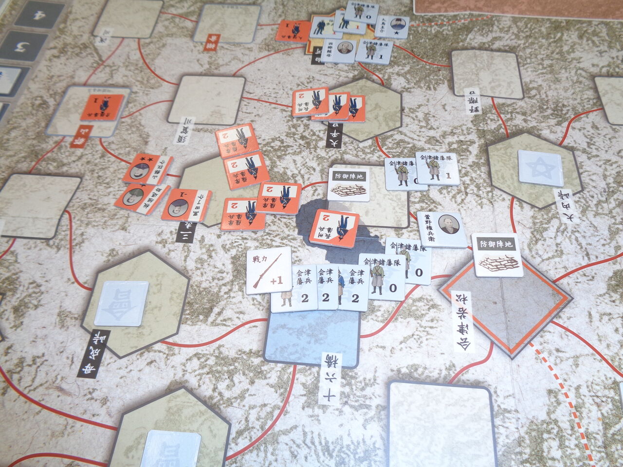序盤、奥羽列藩同盟軍(mitsu)に危機が!2ターンに渡ってイベントとなり(しかも1枚は「同盟脱落」)、全く行動ができず。この間に、新政府軍は白河城を迂回して、三森峠を陥落させます。