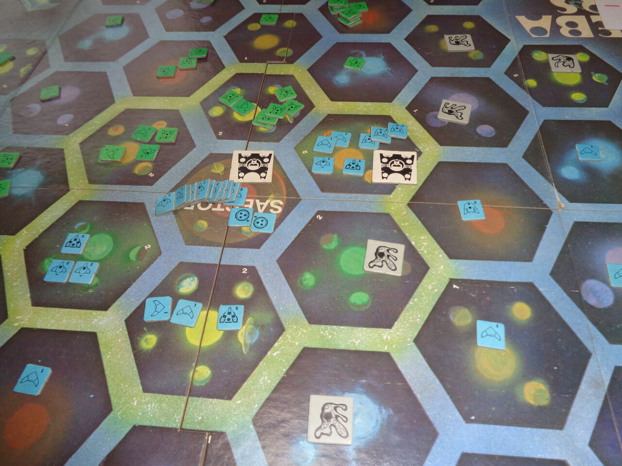 途中、アメーバが猛烈に増殖したり(1ターンに4回の攻撃!)、ランダム故に自分で出したアメーバ・カードで補給線が絶たれたり(笑い)もありましたが、それなりに拡張に成功し、主要太陽系に足掛かりを得るところまで行きます。