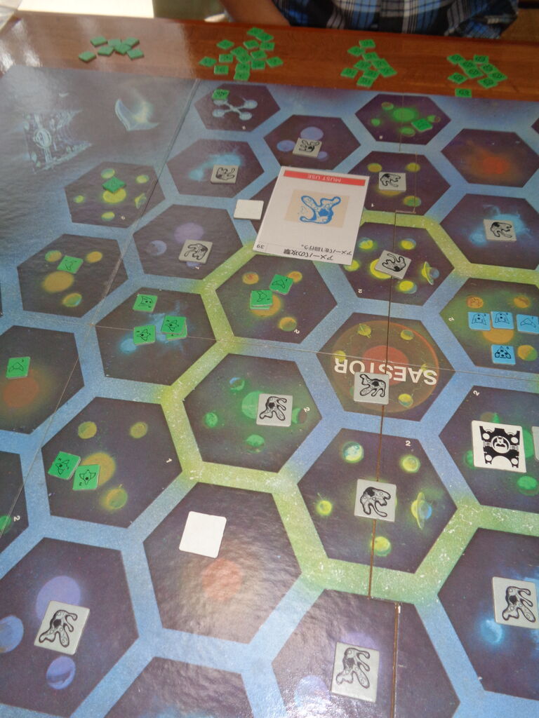 勝利条件は、一定数の主要太陽系(中央の黄色へクスサイドで囲まれた太陽系)を抑えた上で、中心のサエストルを占領することです。2人プレイの時は、6主要惑星中、5つの占領が必要です。