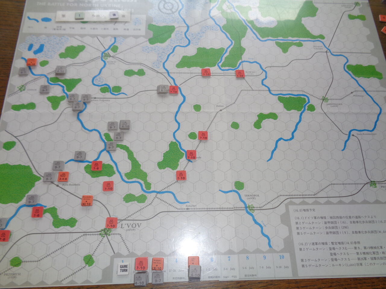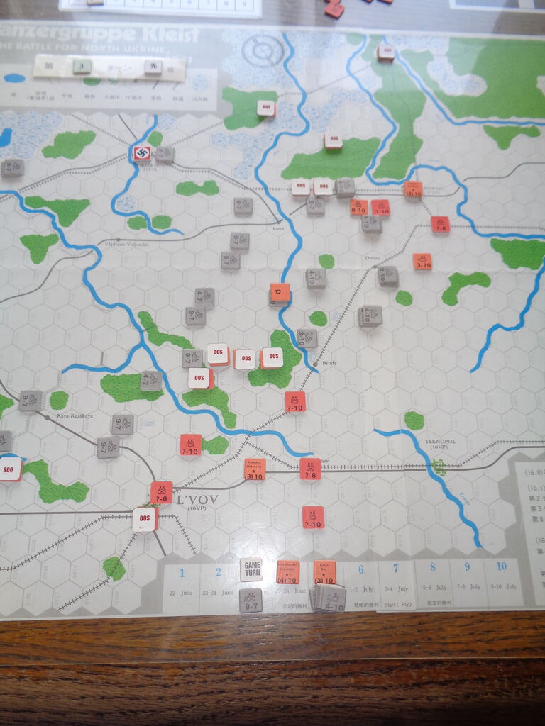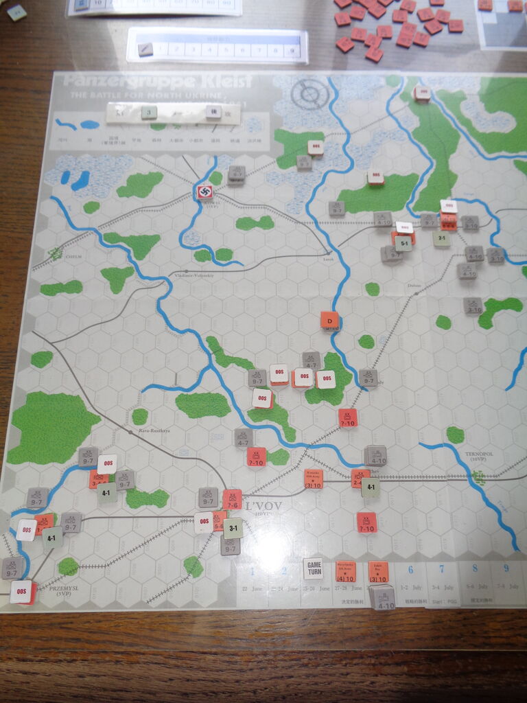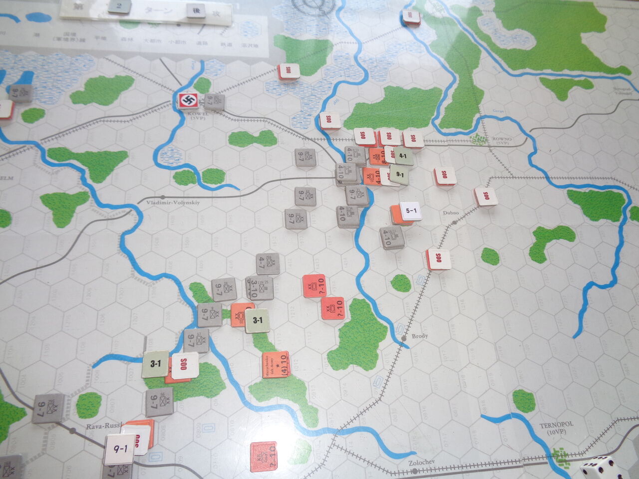 このターンで決めるべく、ドイツ軍はまず、L'vovを占領。大森林と湿地により接近が遅れていたSarnyを、迂回した装甲師団と3個歩兵師団で包囲攻撃し、占領します。Korostenの敵を一掃し、中央部のShepetovkaも歩兵師団で奪取。南部のProskurovだけは、最強の8防御力ユニットが出たため、攻略できませんでしたが、それ以外は全てのVP地点を占拠します。