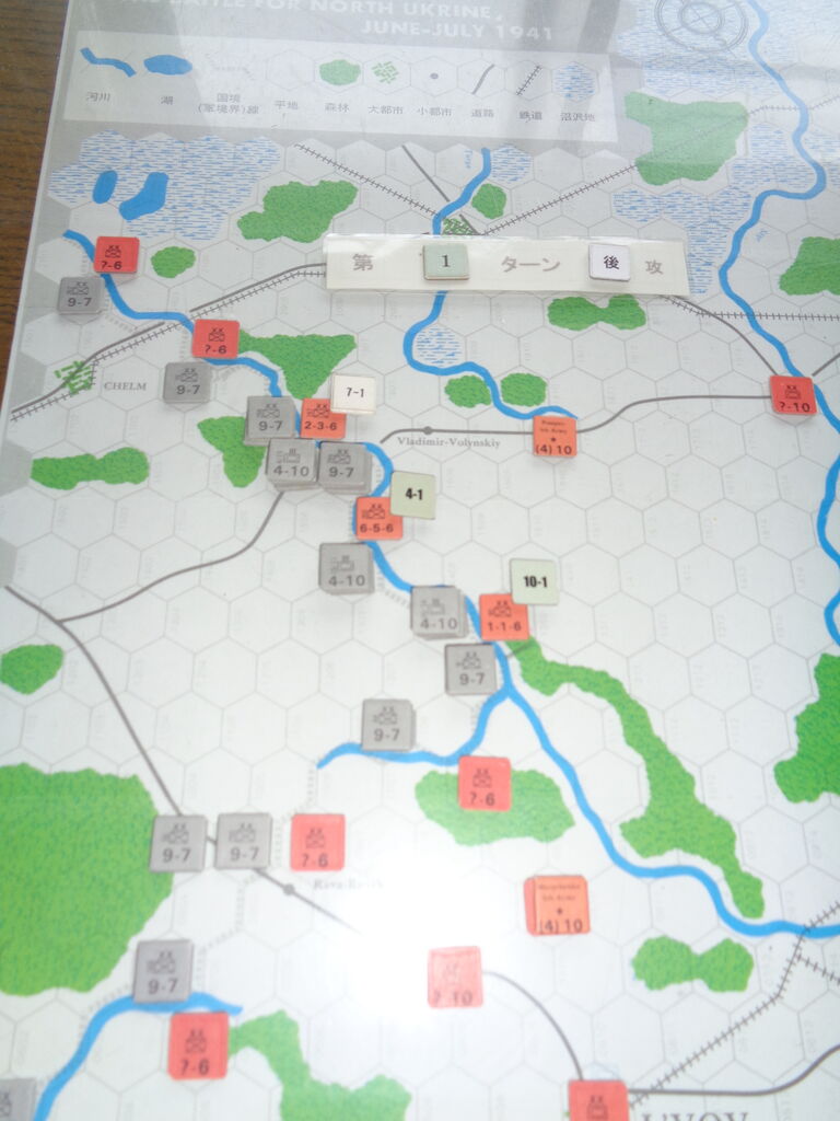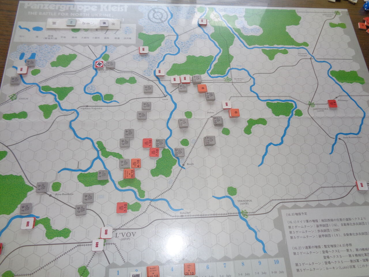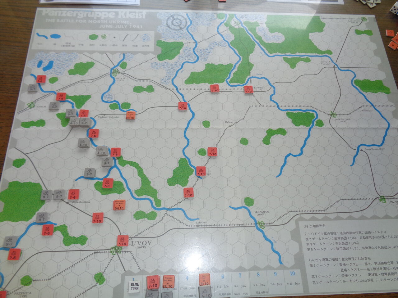 このターンで決めるべく、ドイツ軍はまず、L'vovを占領。大森林と湿地により接近が遅れていたSarnyを、迂回した装甲師団と3個歩兵師団で包囲攻撃し、占領します。Korostenの敵を一掃し、中央部のShepetovkaも歩兵師団で奪取。南部のProskurovだけは、最強の8防御力ユニットが出たため、攻略できませんでしたが、それ以外は全てのVP地点を占拠します。