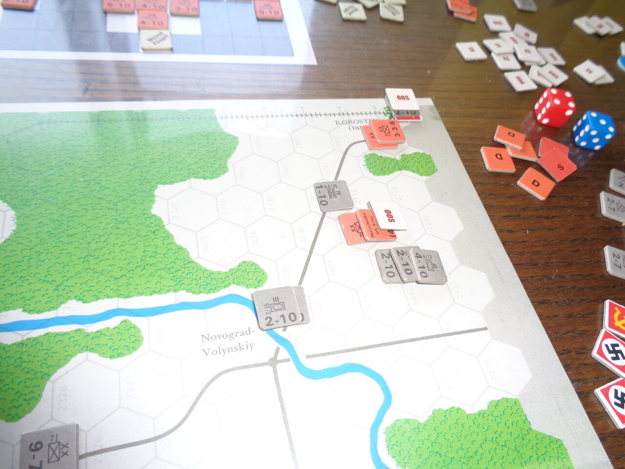第4ターン、もはや組織的な防衛が破綻したソ連軍は、2個狙撃兵師団を投入して、Korostenにいる1個自動車化連隊に反撃を行います。自動車化連隊は補給切れなものの、都市の地形効果で実質の戦闘力は変わらず、戦闘比はわずか1:1に。が、ここで赤軍は意地を見せ、最善のdrで自動車連隊をステップロスさせます。