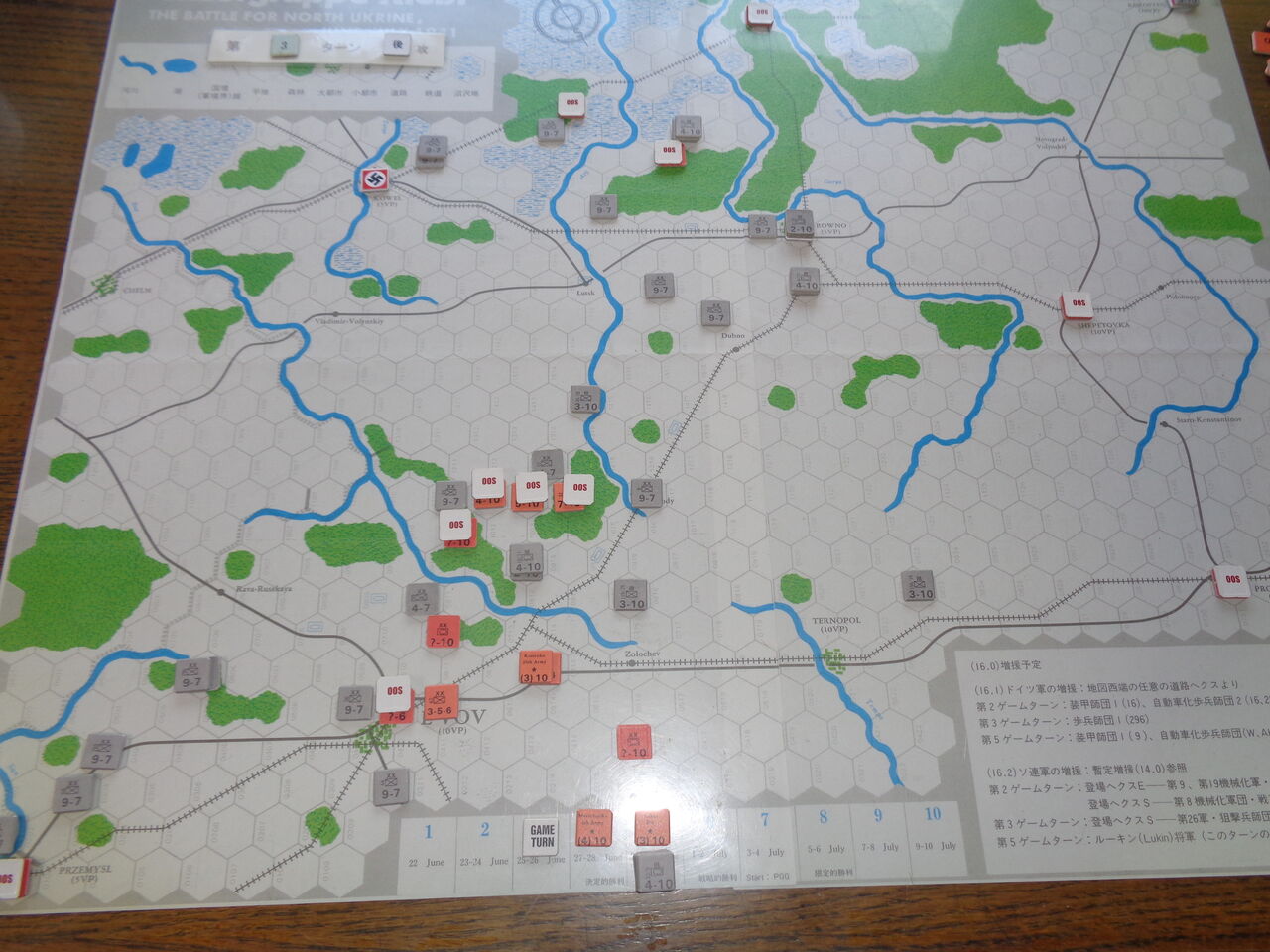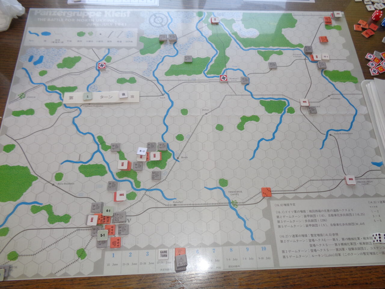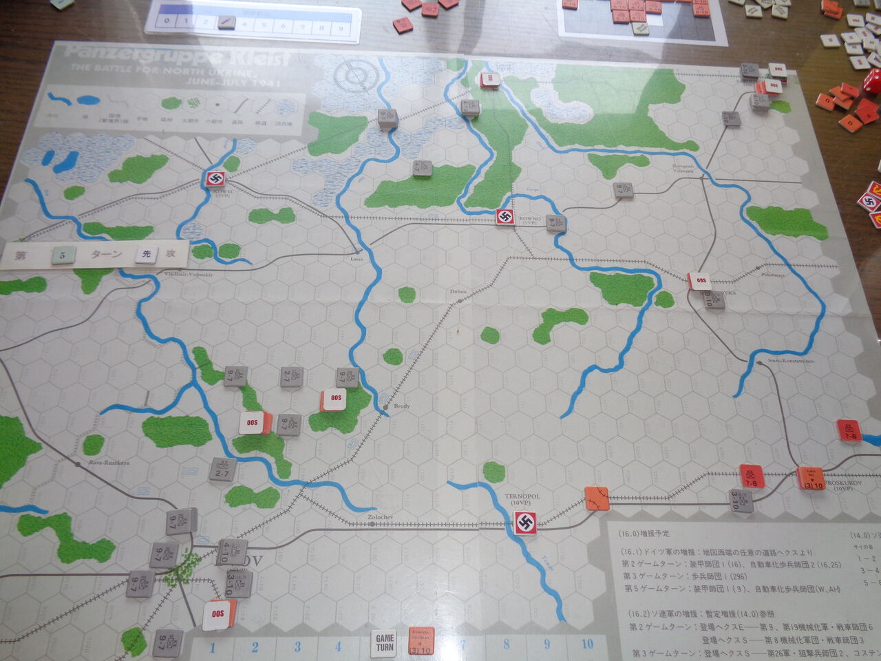 第5ターン、ソ連軍の頼みの特別増援は、わずかに2個師団。状況は絶望的ですが、占領を遅らせんと、Proskurov前面から側面にかけて戦線を構築します。