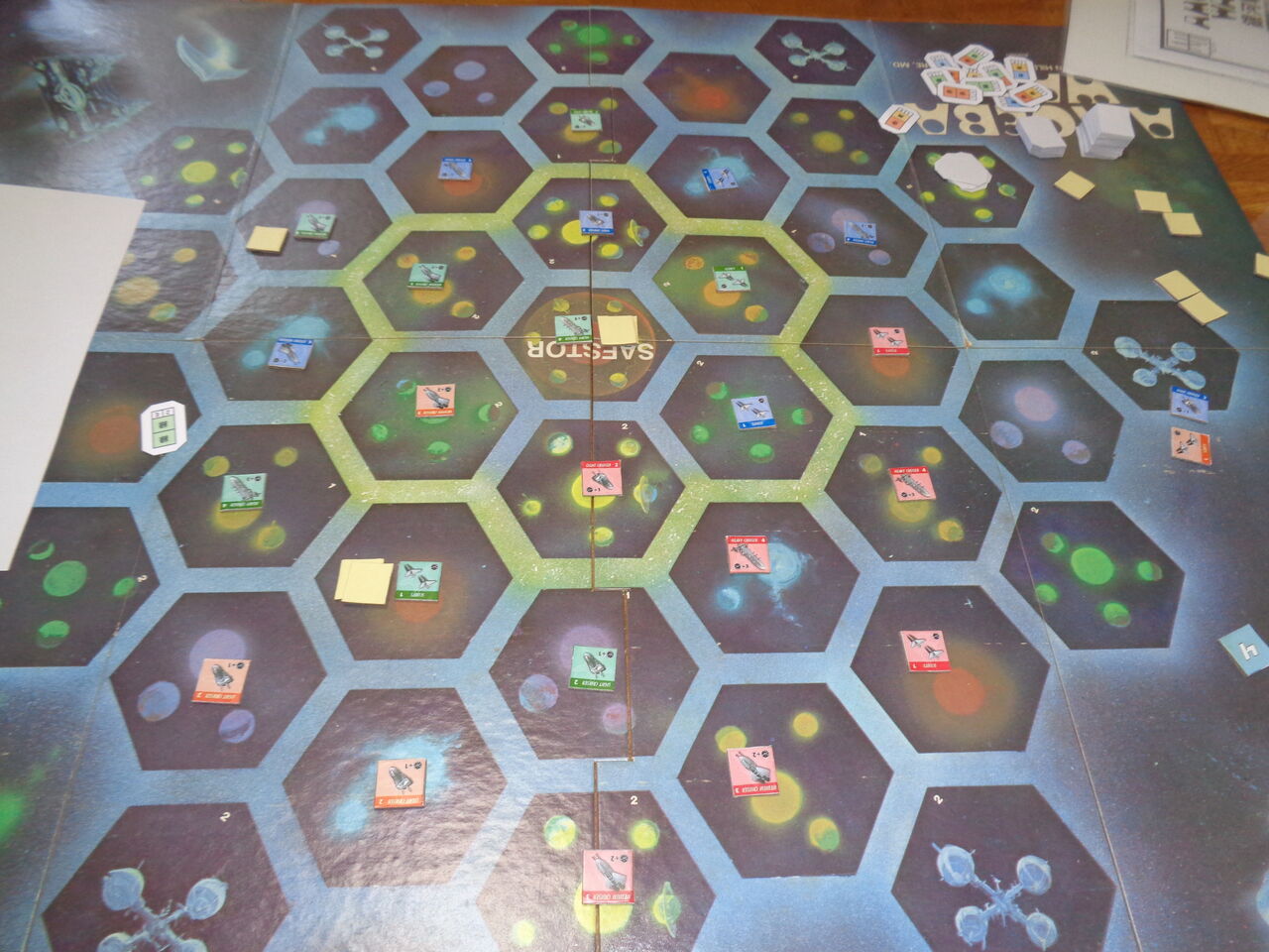 基本は協力型の双六で、プレイヤーにはそれぞれ、秘密裏に艦隊の編成プロット(2色の艦艇で構成)が配られます。順番が来ると、いずれかの色の1艦艇をマップに置き、それが秘密裏の編成プロットに当てはまるかどうかを提示します。たとえば、赤-青のプロットなら、同2色が隣接する宙域にいれば、艦隊が編成され、マーカーを置きます。すでに置かれた艦艇も対象で、複数の艦隊ができることもあり、その場合は全ての艦隊分、マーカーを置きます。